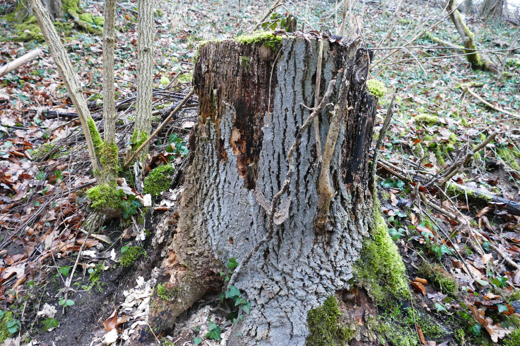 Etwa 20 m von Bach entfernt, am Waldrand steht ein grau überzogener Baumstubben.