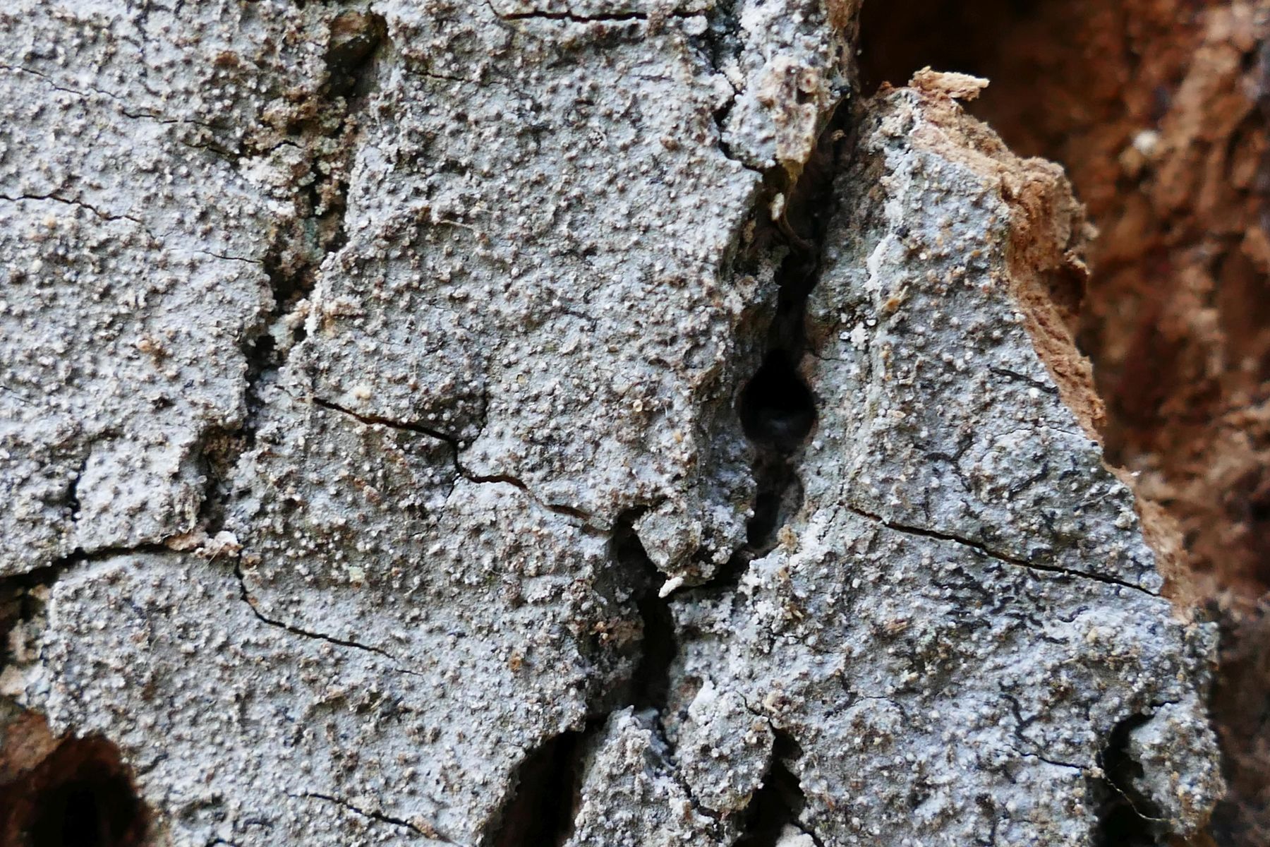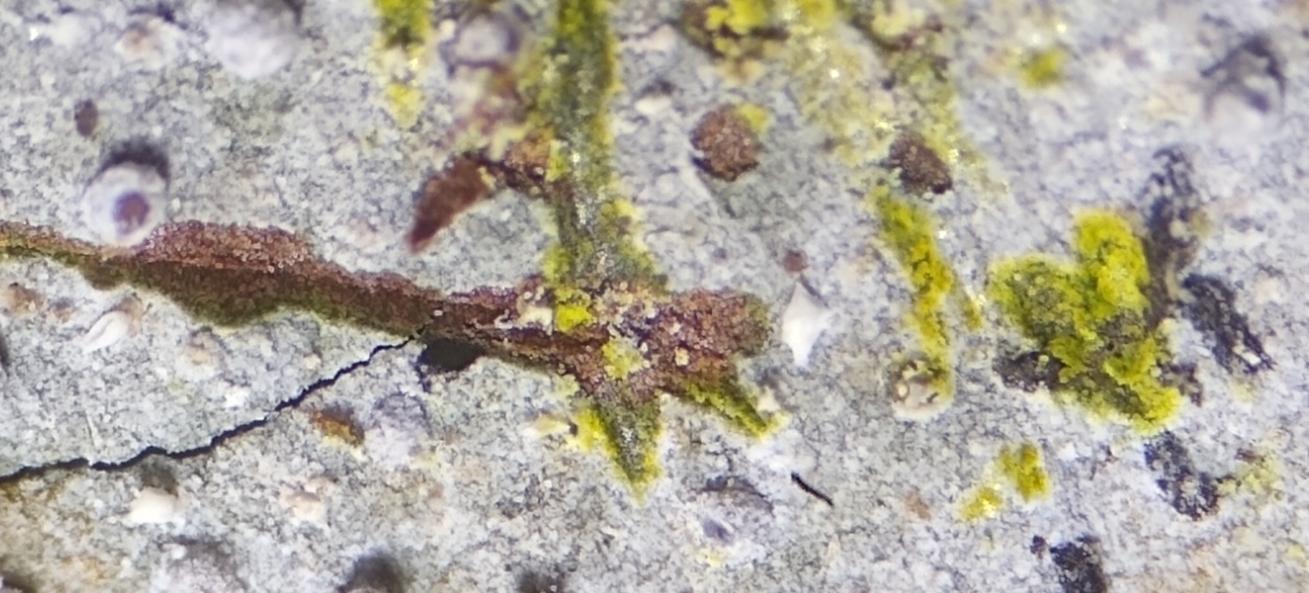 Würmchenförmig austretende Pyknosporenmasse habe ich auf der Probe zwar nicht gefunden, aber es ist leicht vorstellbar, dass nach längerem Austreten eine längliche, weiße Sporenmasse in Form von Würmchen beobachtet werden kann, woher der Name der Flechte rührt.