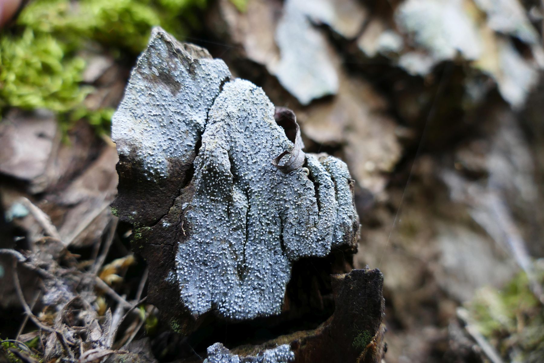 Ein hellgrauer Thallus ist mit vielen weißen, kugelförmigen Pyknidien übersäht.