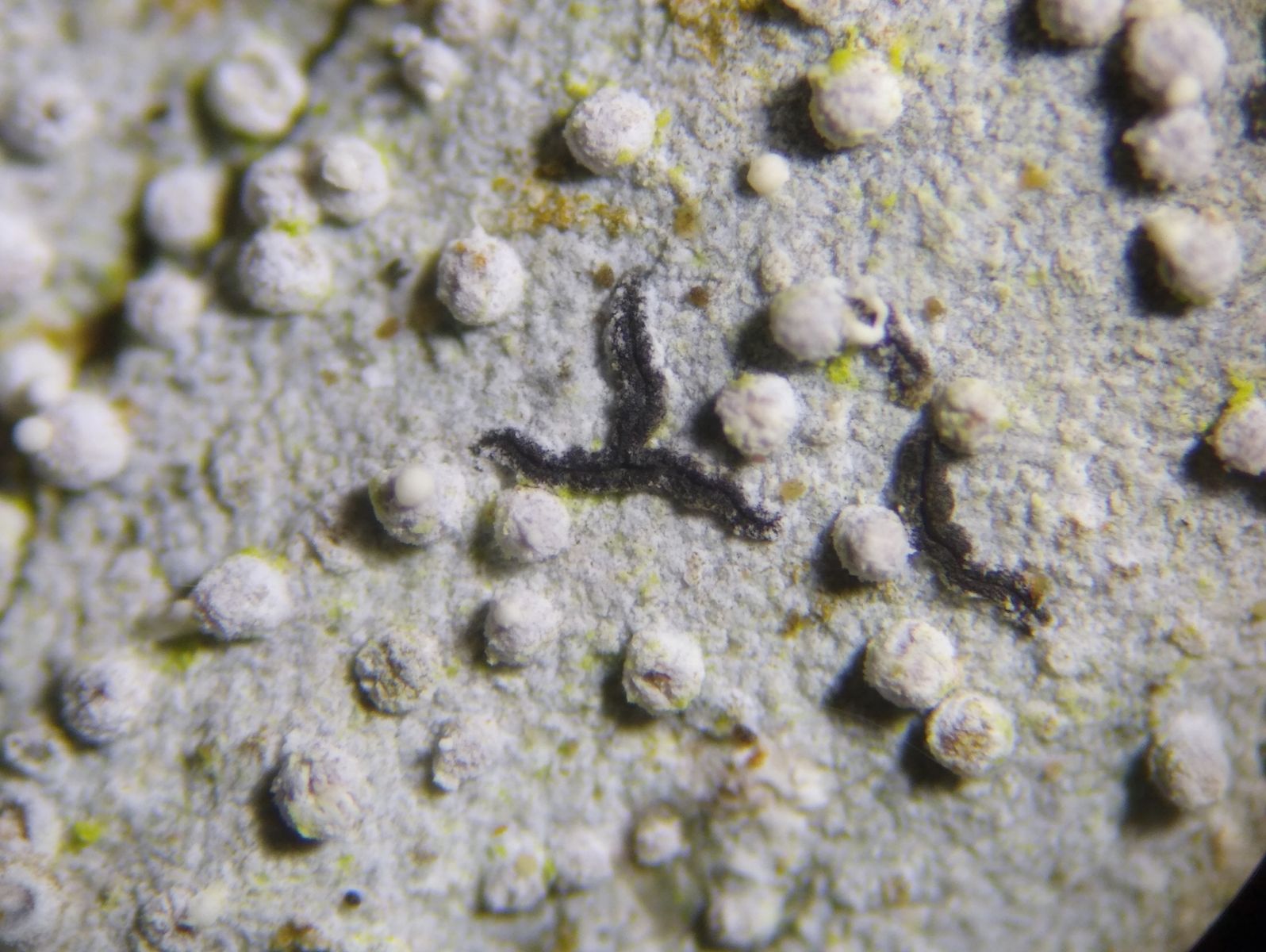 Bild 2 Flechte mit hellen Pyknidien und schwarzen, langgezogenen, teilweise verzeigten Apothecien