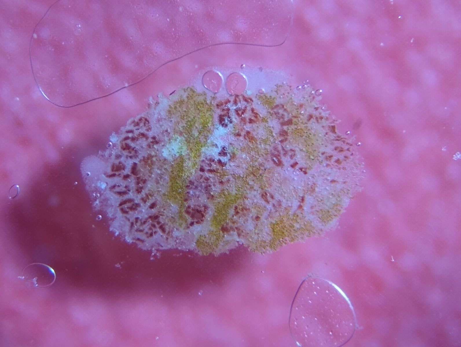 Die orange gefärbte Kruste färbt dunkelt nach KOH-Zugabe deutlich ab und wird braun.