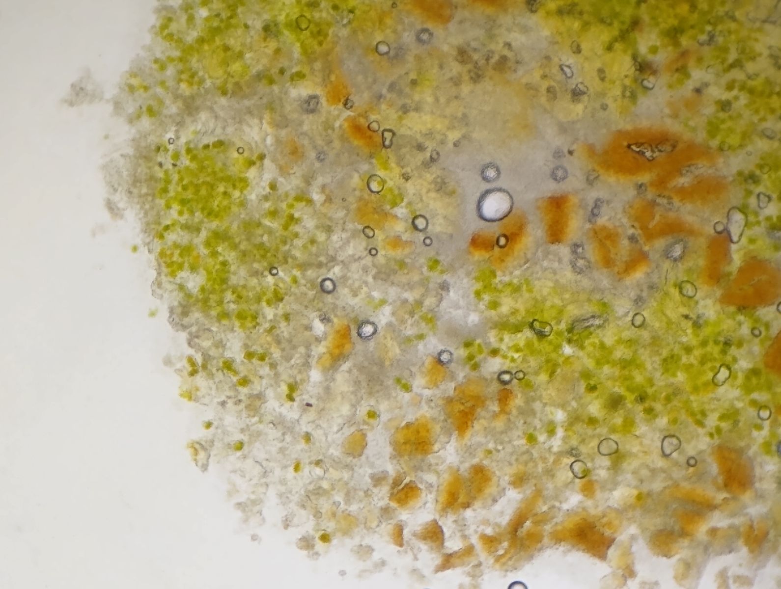Ein paar Pyknidien auf den Objektträger und anschließend zerquetscht, setzt die Algen und Sporen im Wasser frei