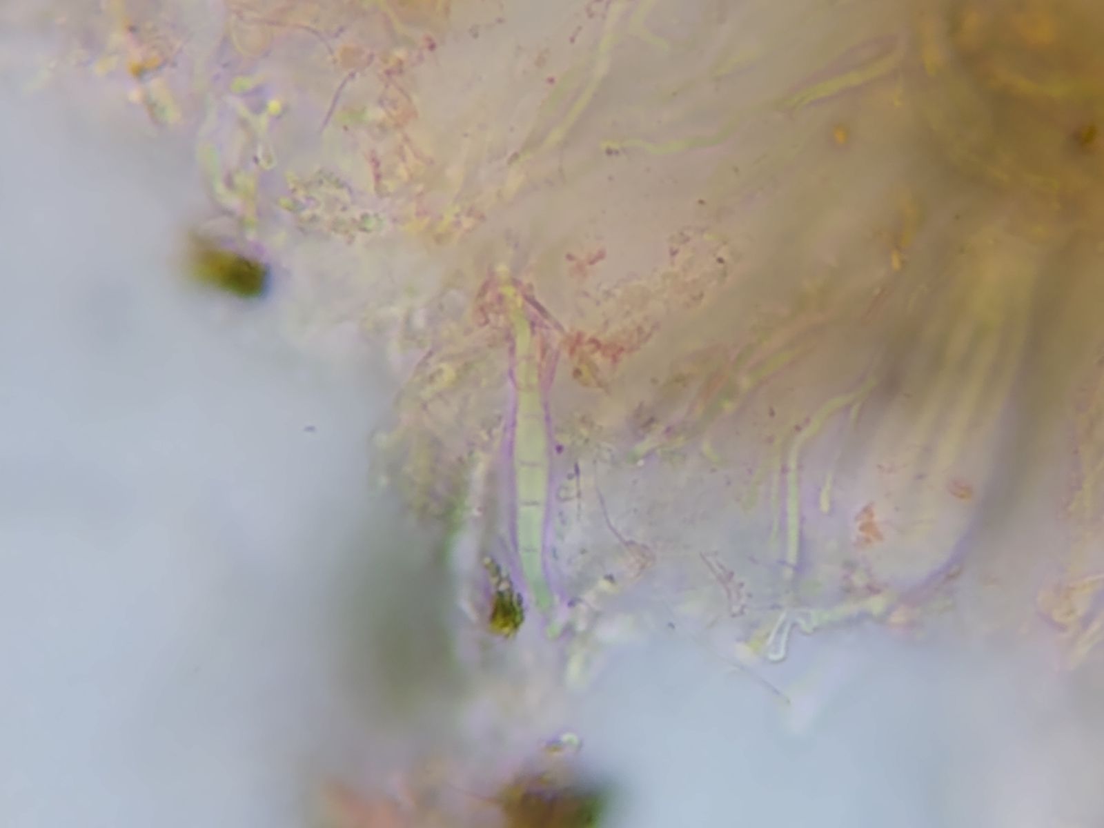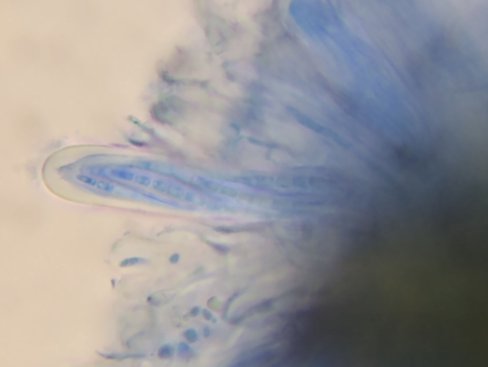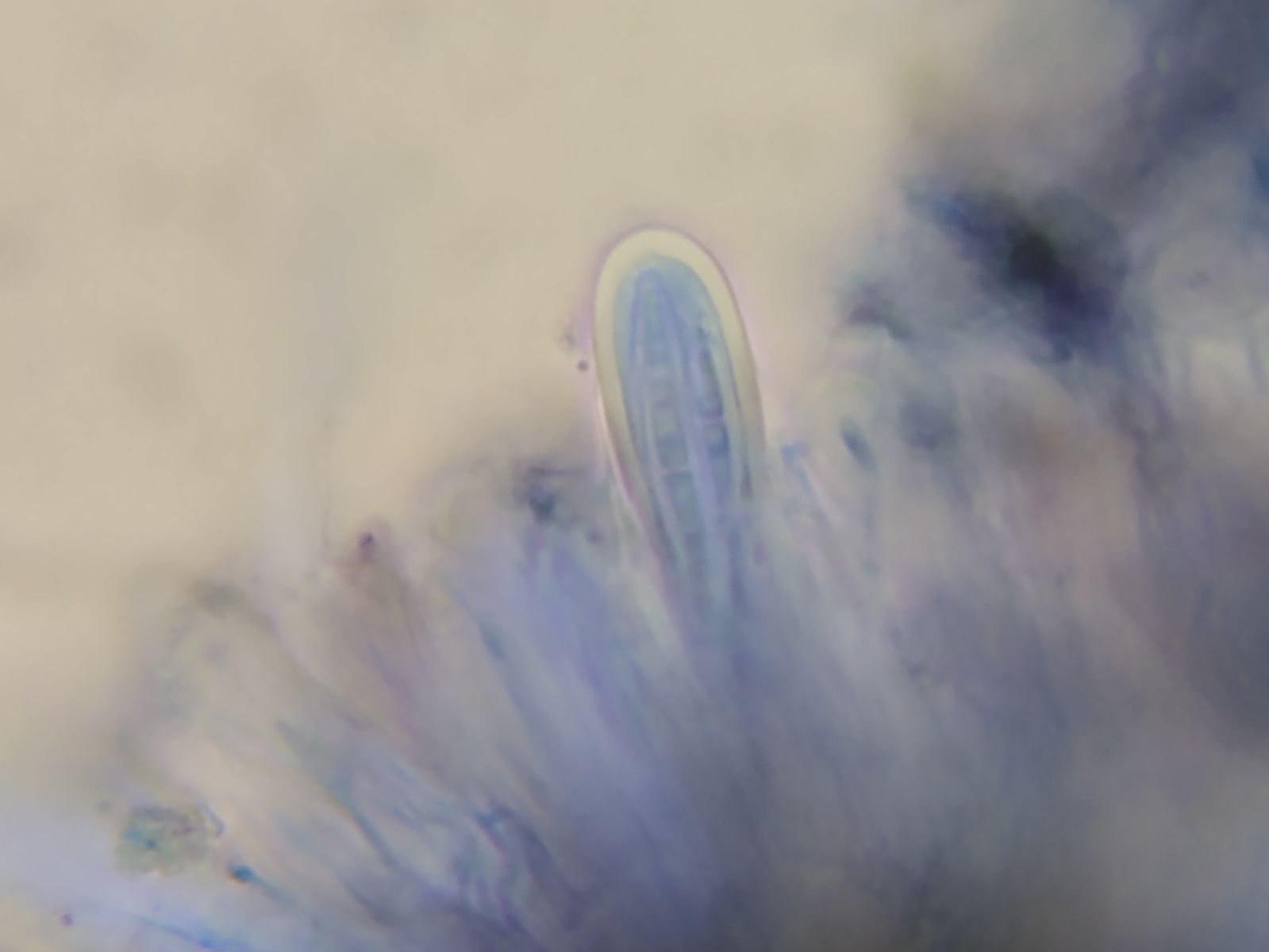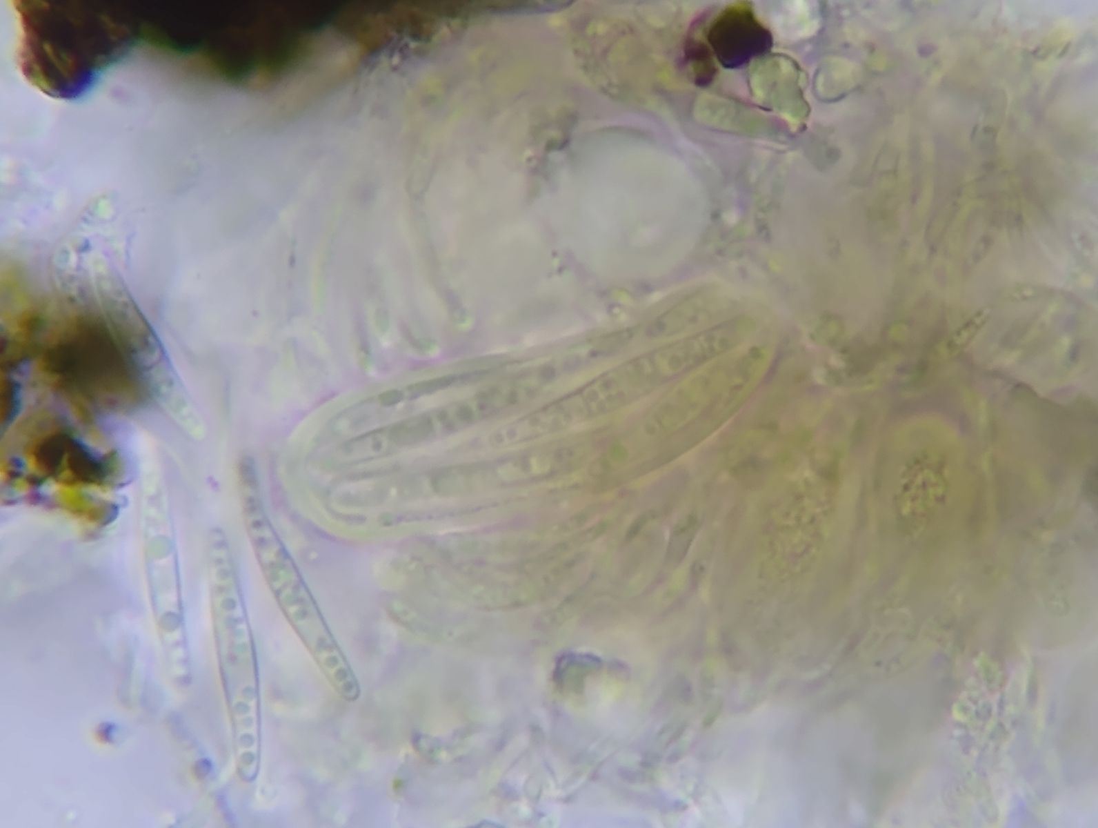 Die Sporen sollten mehrfach septiert sein, was im Wasser und in den Schläuchen nur andeutungsweise zu erkennen ist.