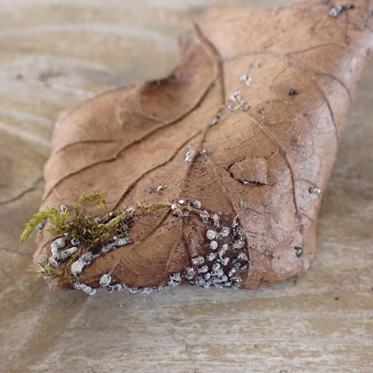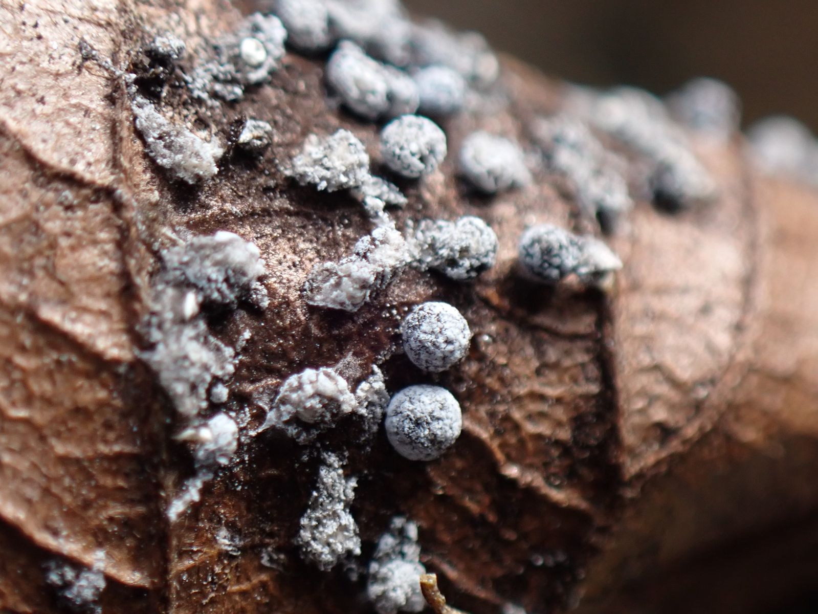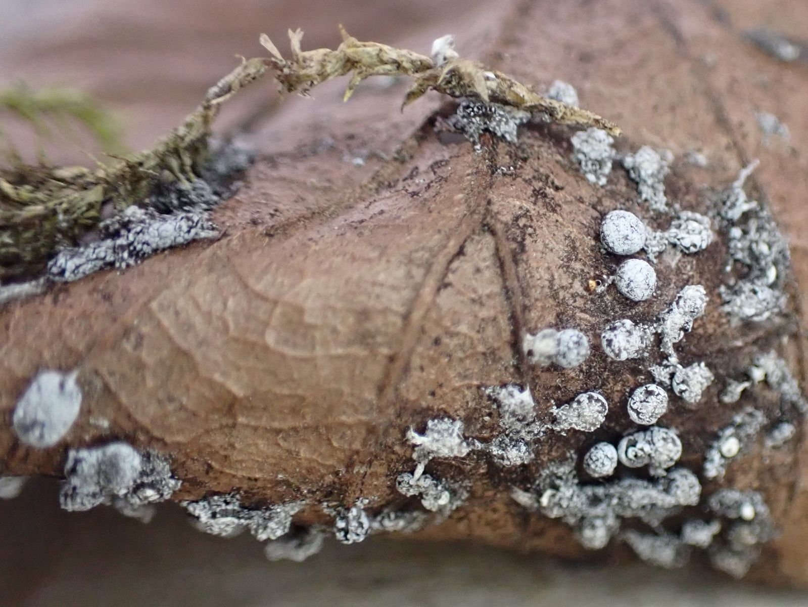 Schleimpilz auf Buchenblatt? Didymium squamulosum