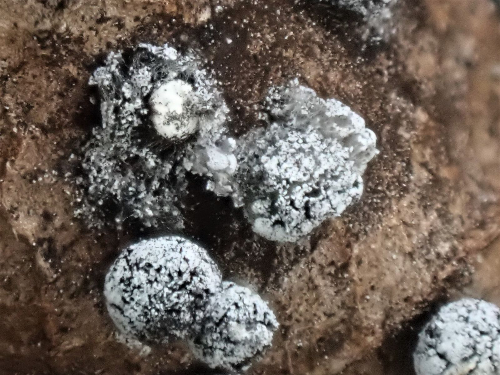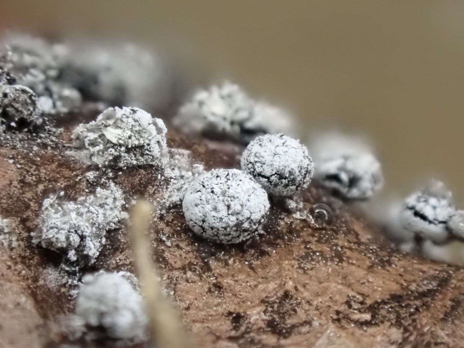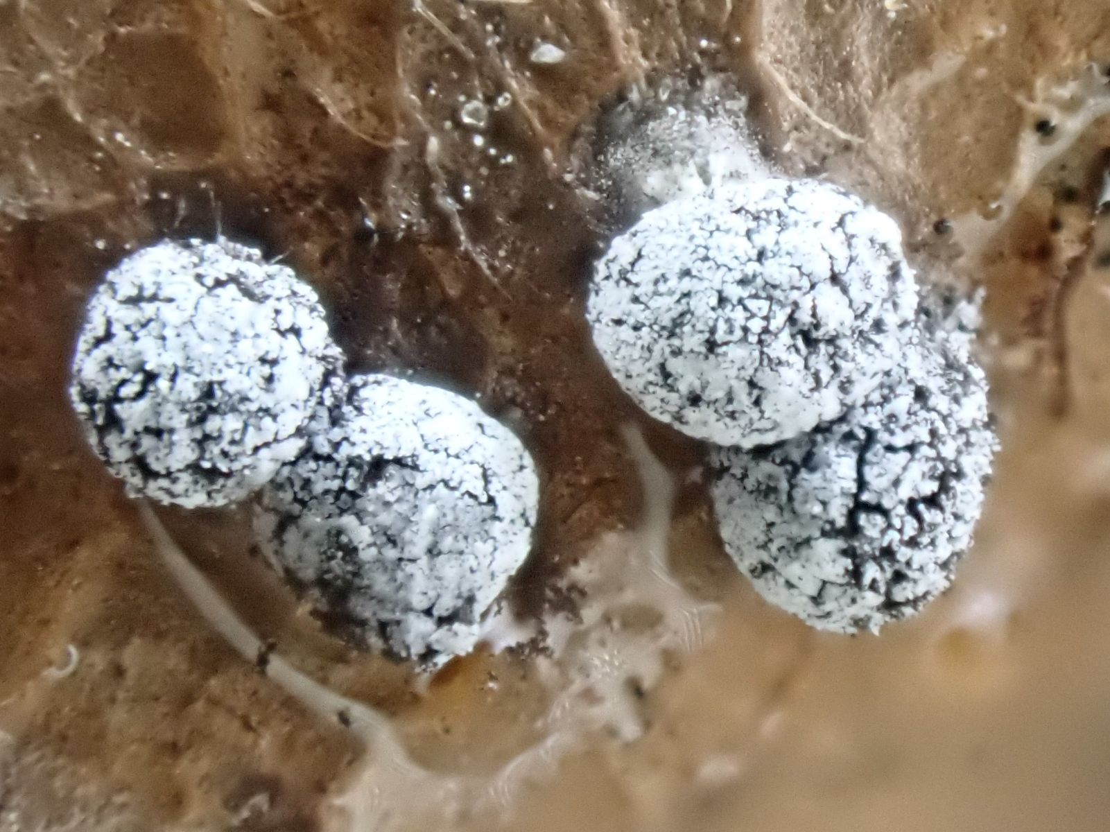 Die Furchtkörper haben eine kalkhaltige Peridie, da käme Physarum, Didymium in Frage.