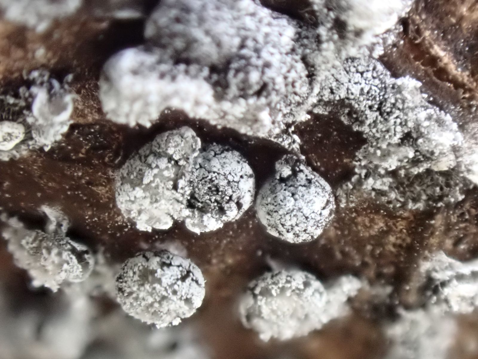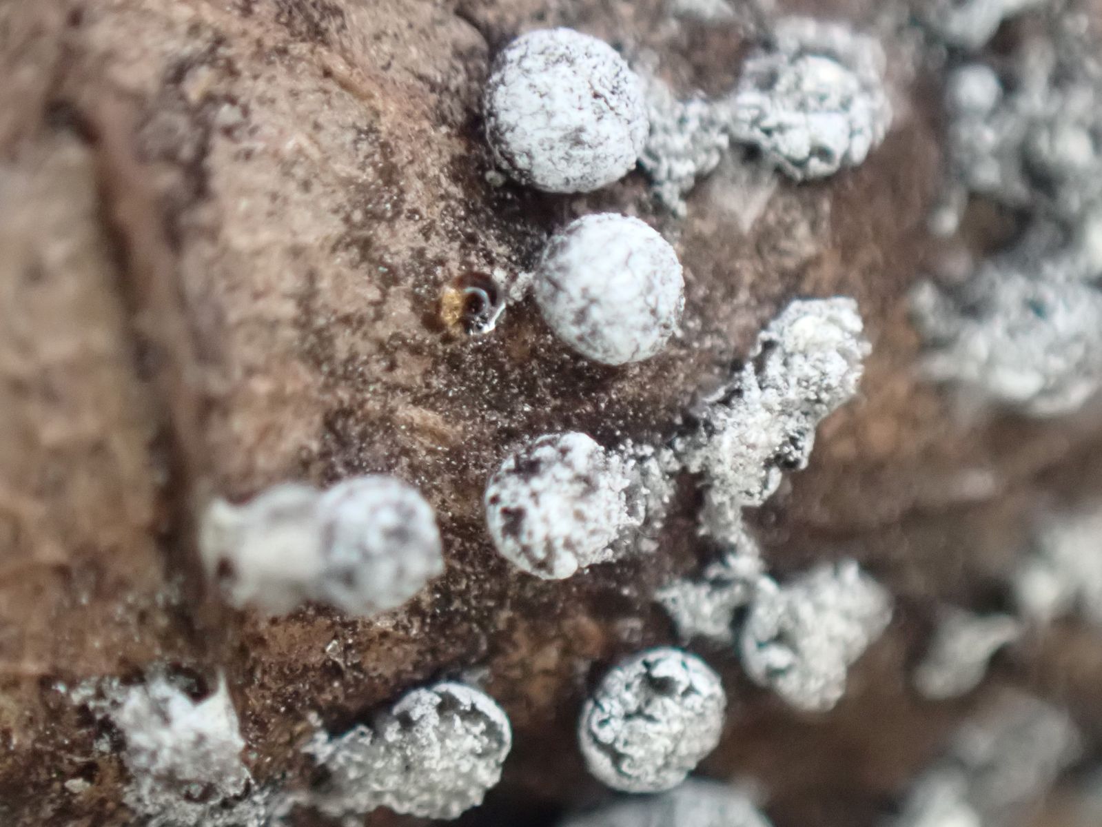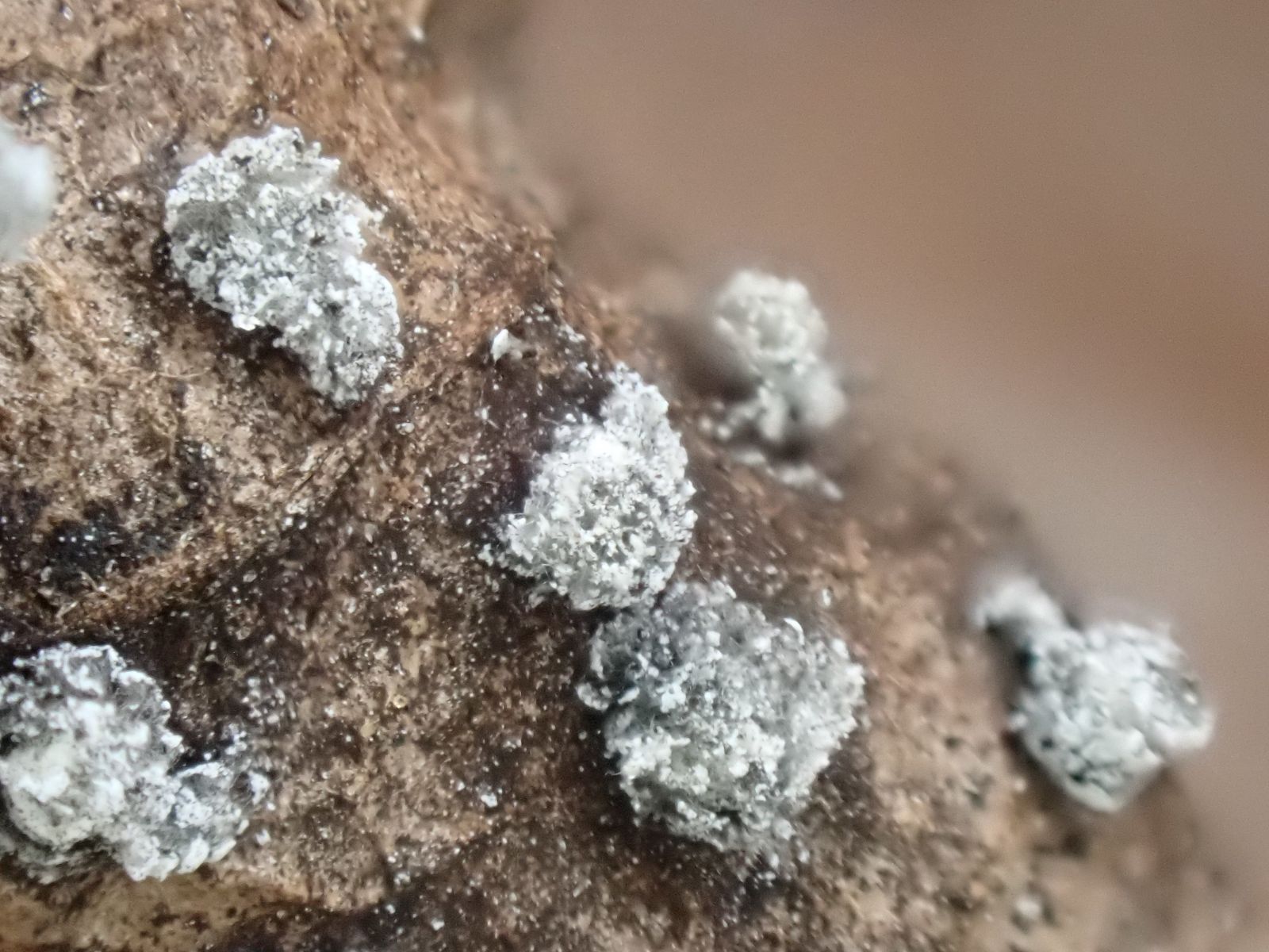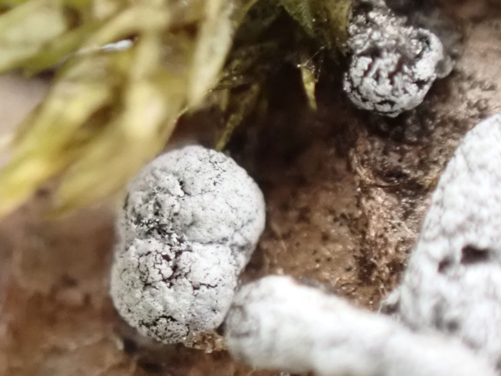Die Furchtkörper haben eine kalkhaltige Peridie, da käme Physarum, Didymium in Frage.