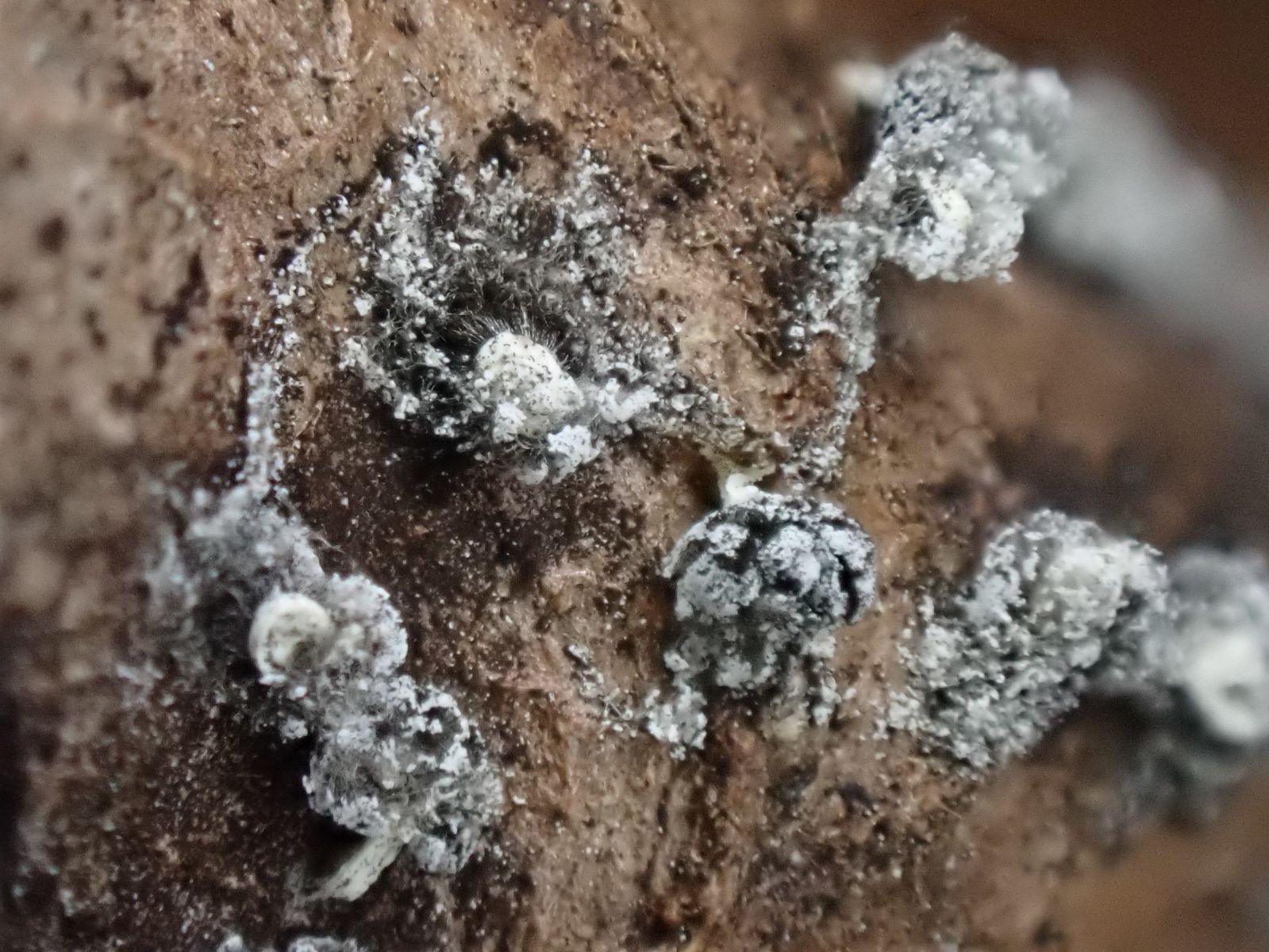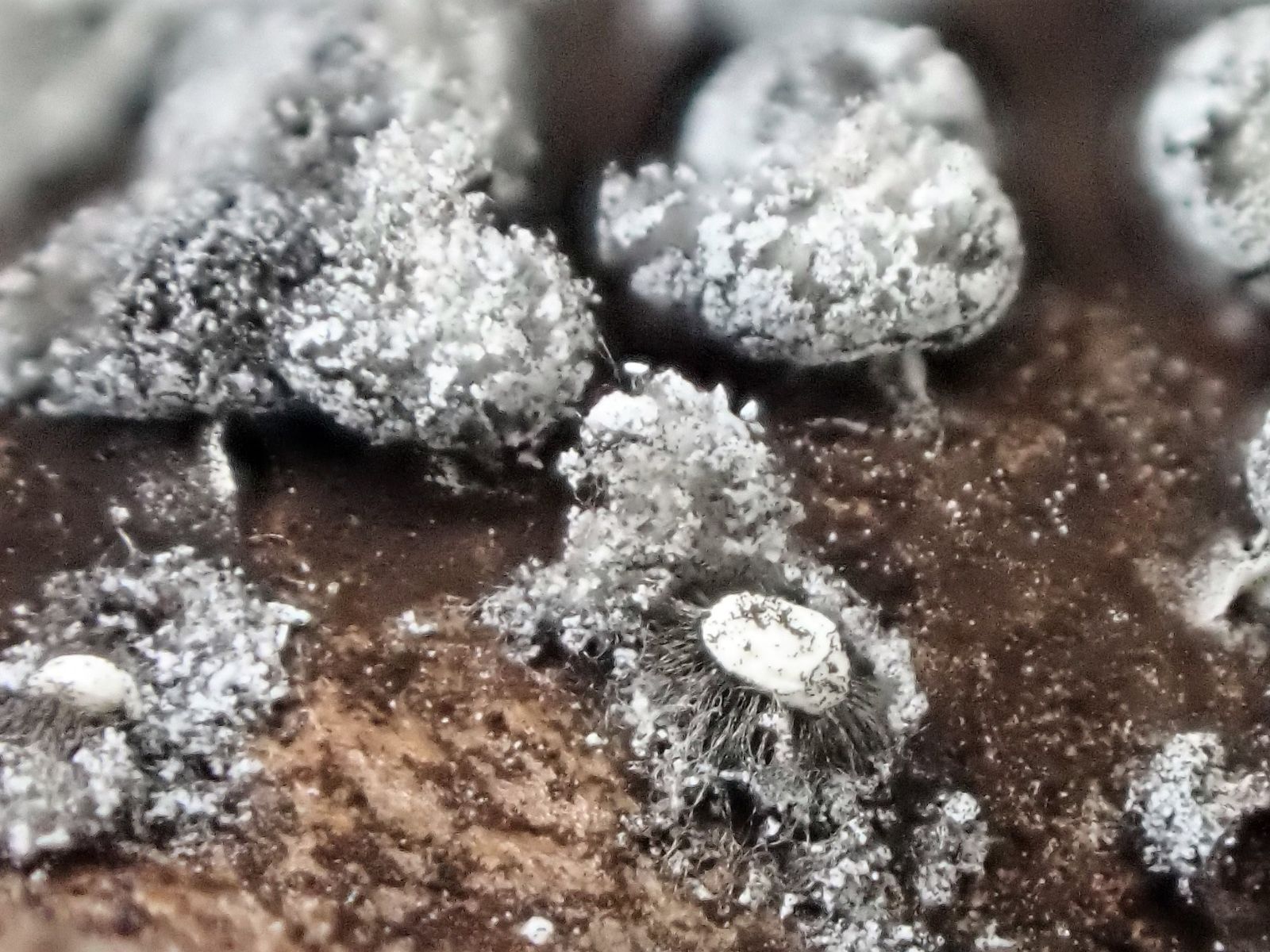 Aber auf dem 2. Foto unten rechts sieht man, dass die Fruchtkörper eine große weiße Columella im Innern haben (das schließt Physarum aus), auch weiße Stielchen sieht man.