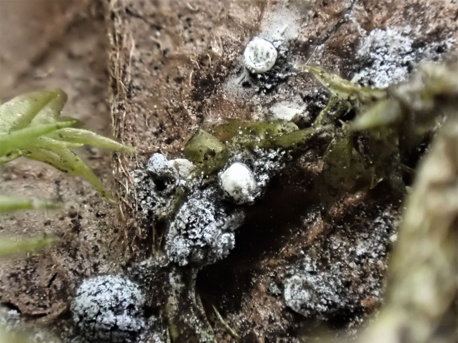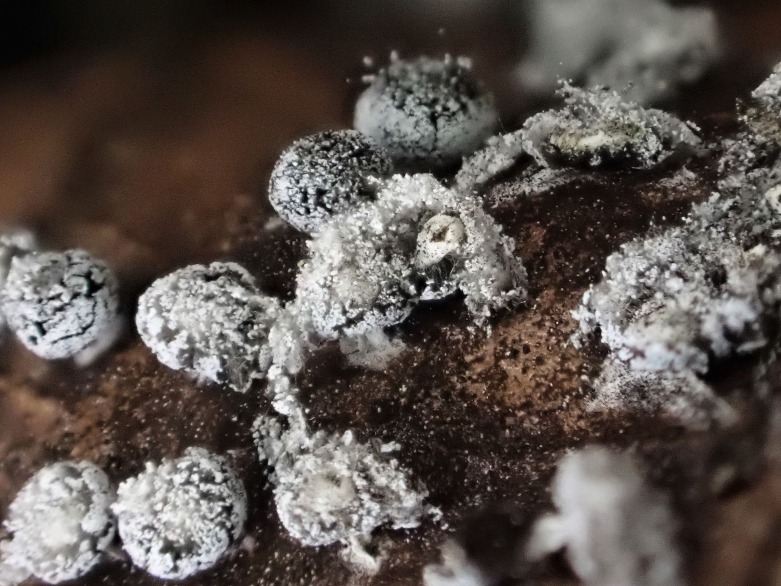 Die Art kommt häufig auf Laub vor, ist normalerweise gestielt, kann aber auch fast sitzend sein. Der Kalk auf der Peridie ist kristallin, das sieht man unterm Mikro recht gut.