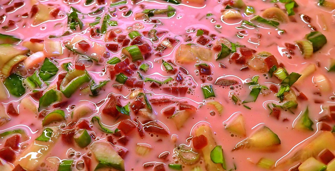 Verrüht mit eisgekühlter Buttermich sowie Saurer Sahne und garniert mit halben Wachteleiern ergab das eine Kalte Litauische Rote-Bete-Suppe.