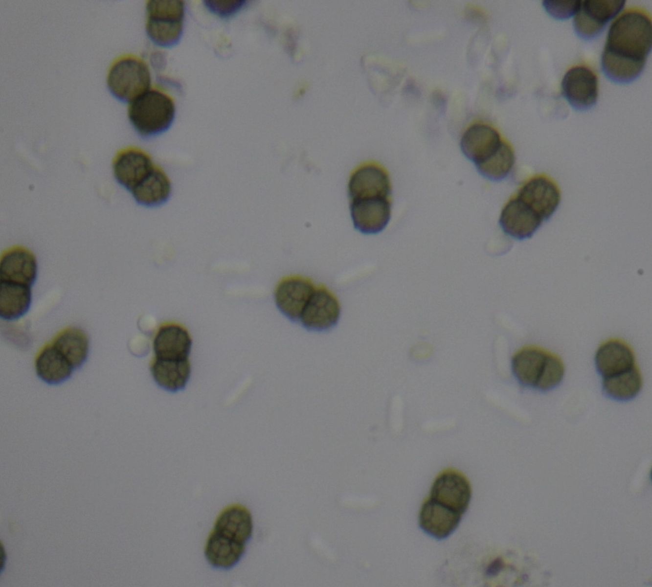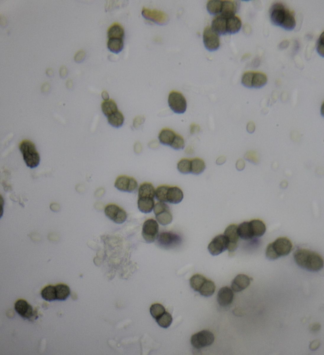 Pseudothezien flach dem Substrat aufsitzend. Sporen 1-s,braun, ornamentiert (7-8 x 4,4-5 µ), Asci rundlich-sackförmig