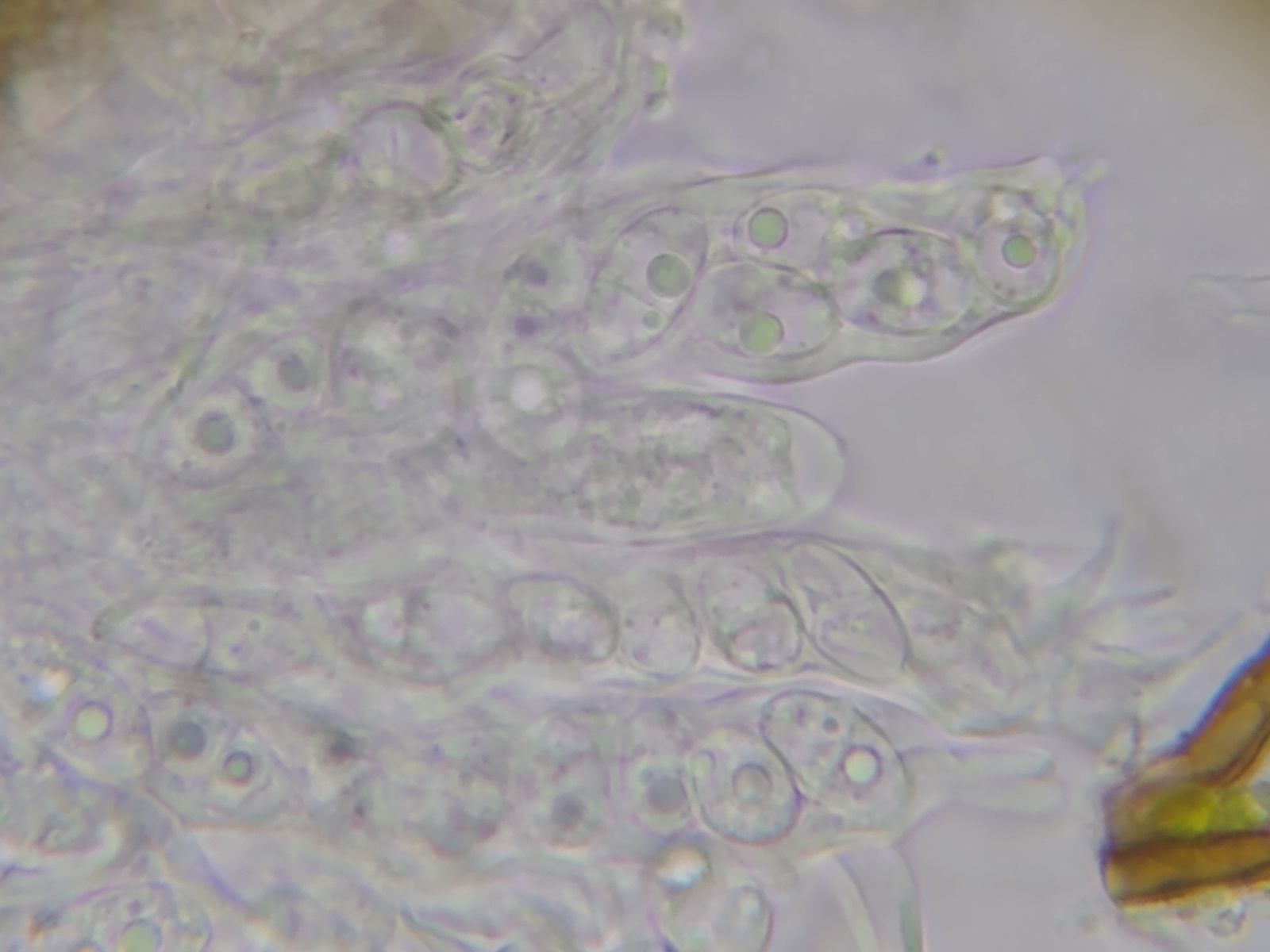Bild 10 In Lugol gefärbte Asci und Sporen, die dicke Ascusspitze bleibt ungefärbt