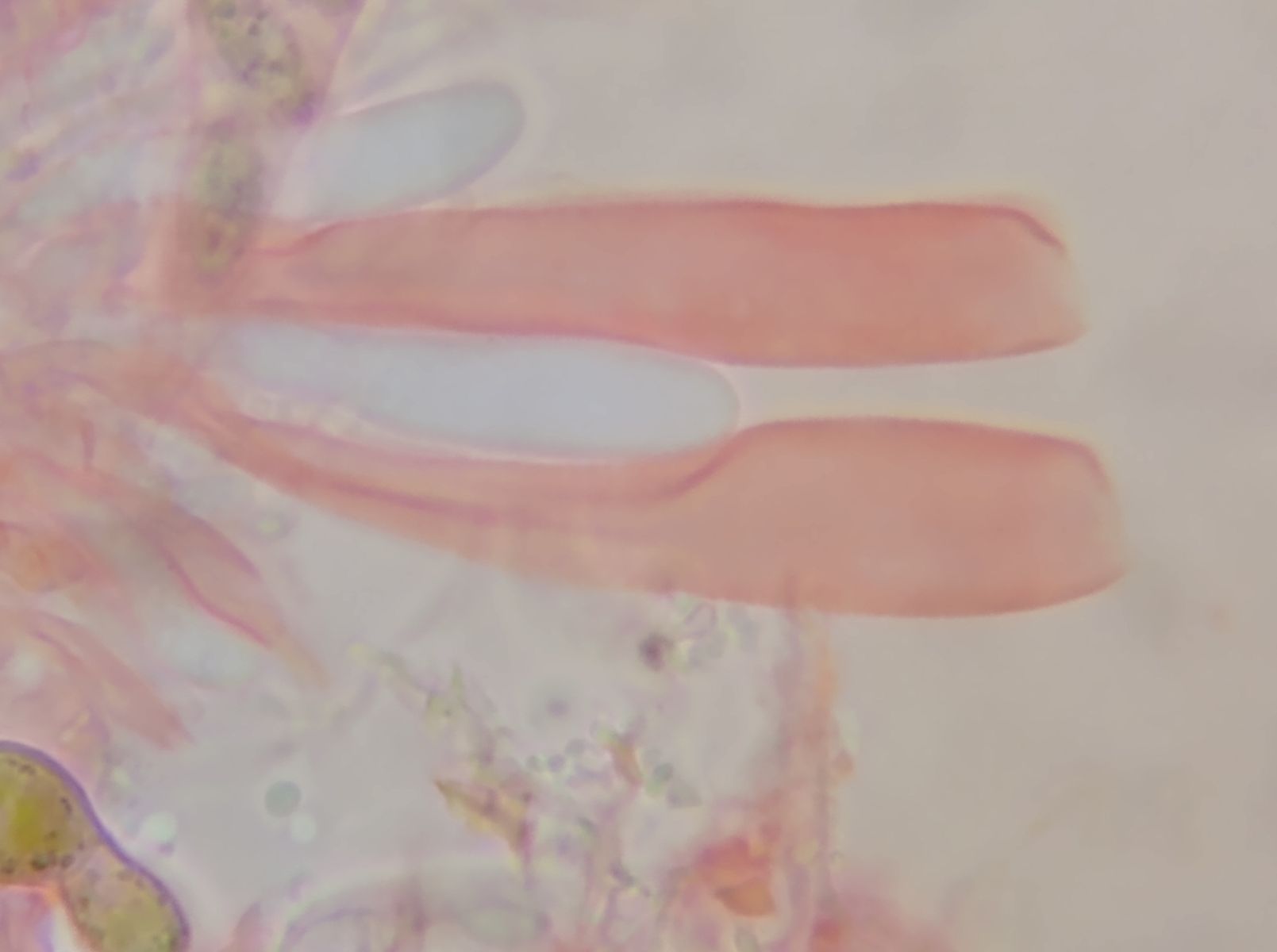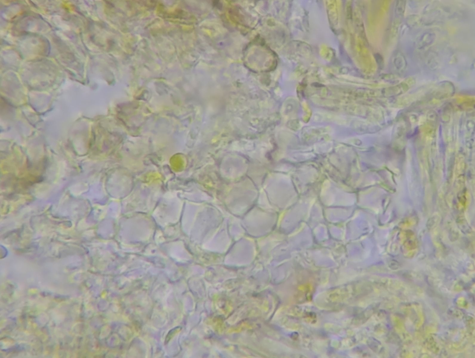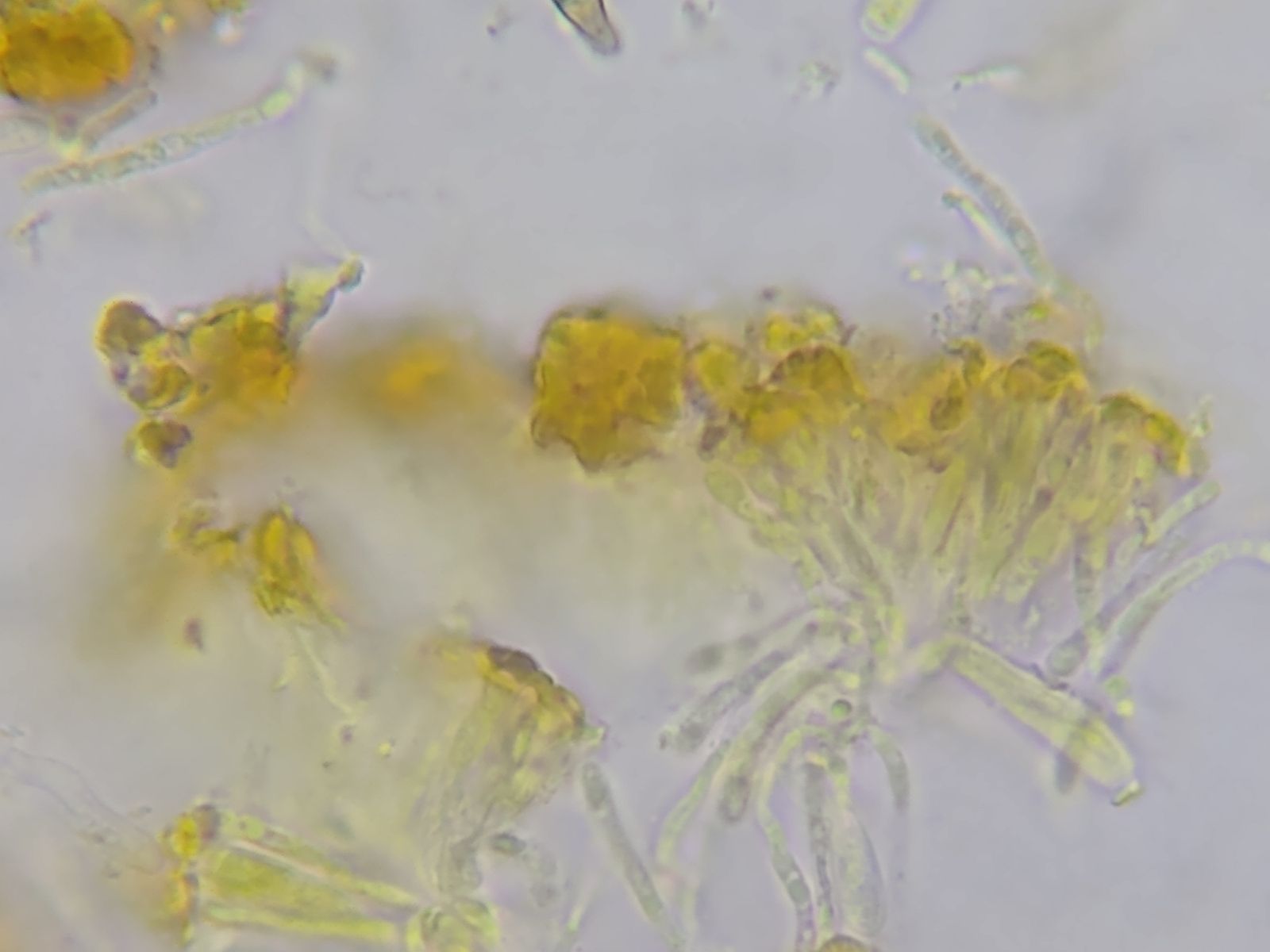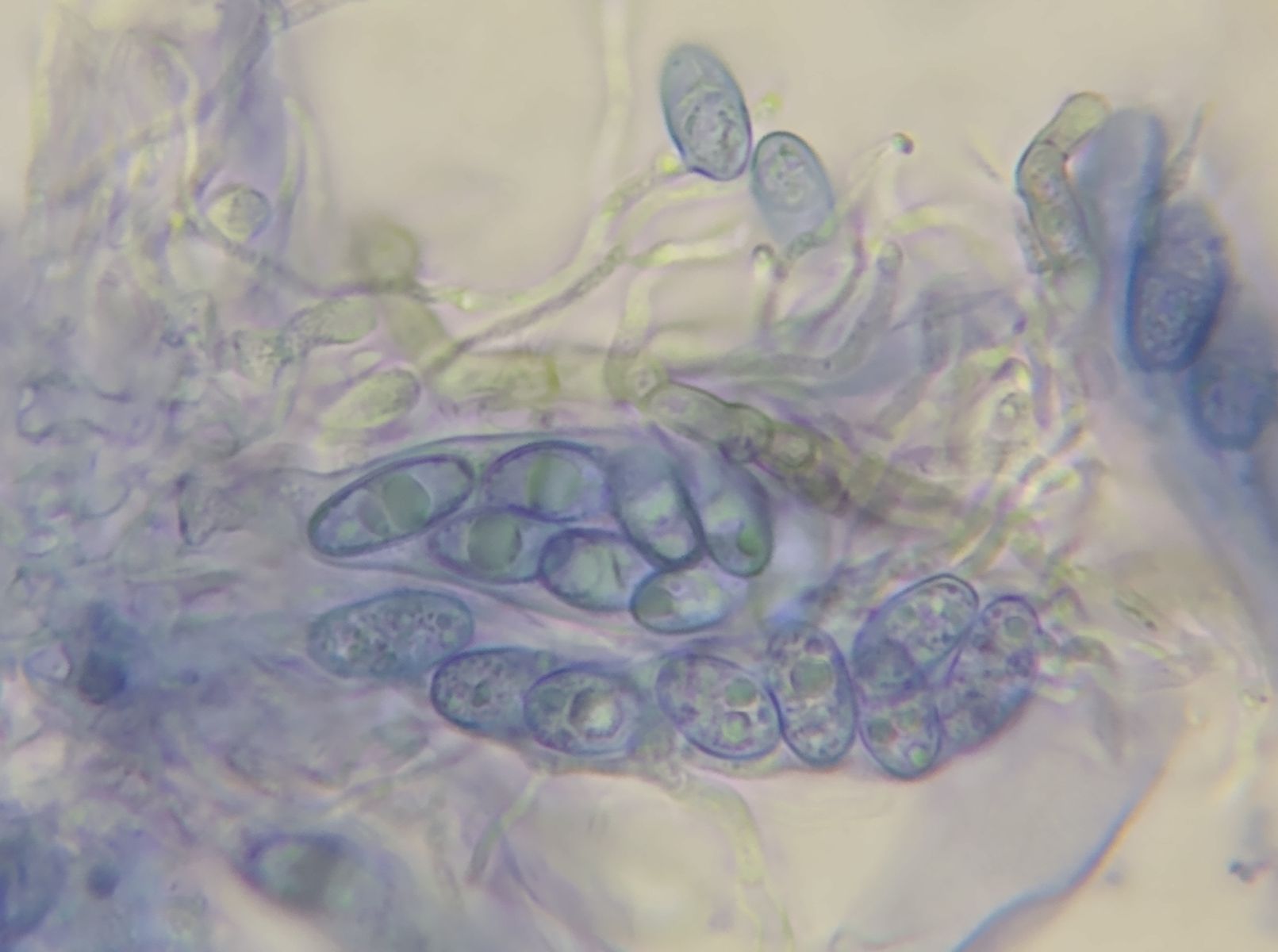 Die Sporen sind eventuell dextrinoid, da bereichsweise orangebraun eingefärbt.