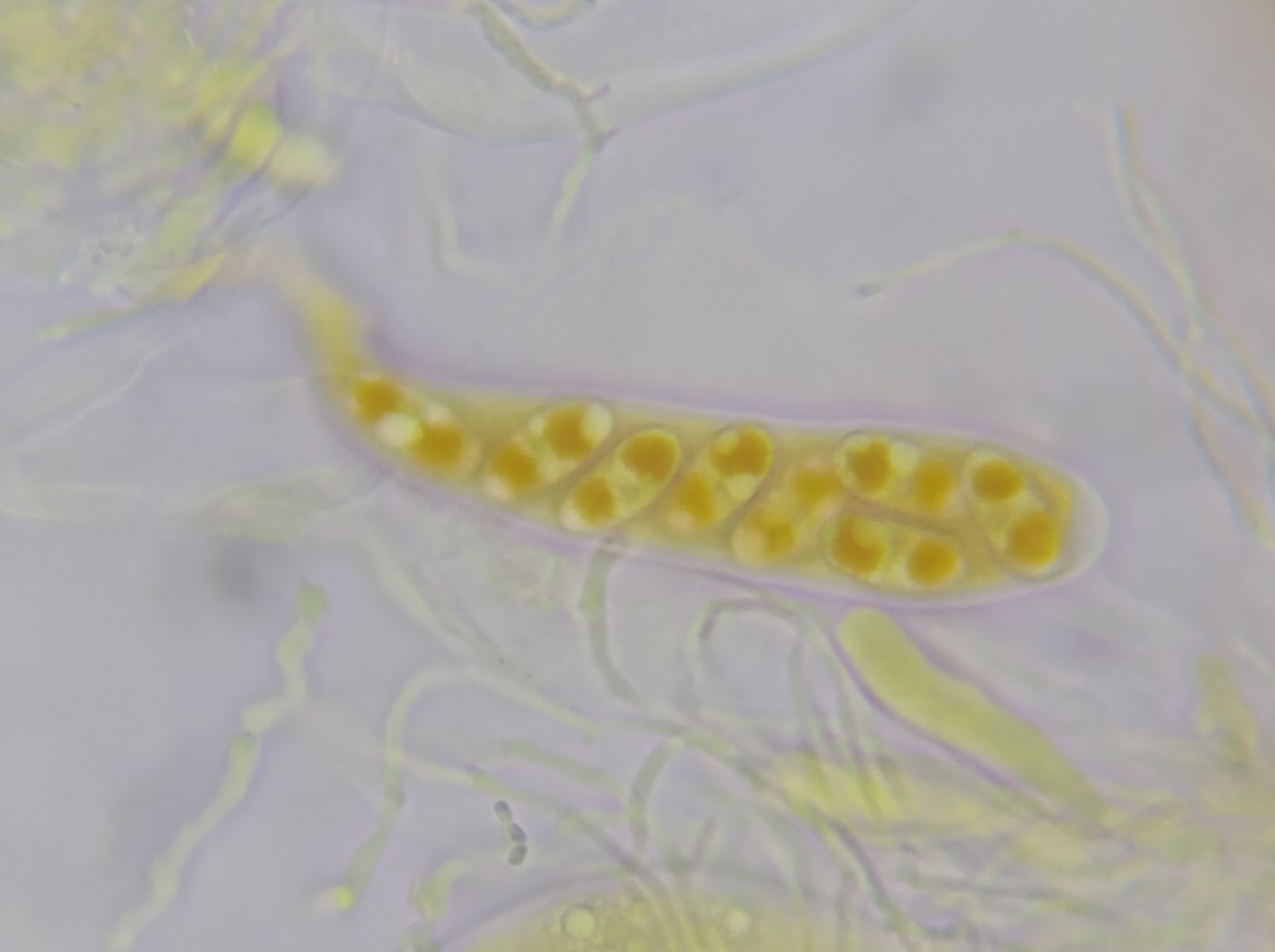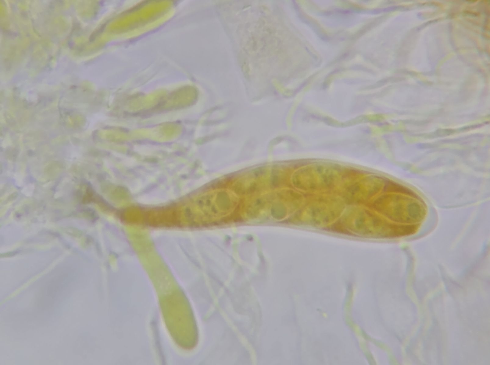 Die achtsporigen, keulenförmigen Schläuche sind etwa 50µm lang und 10µm dick.