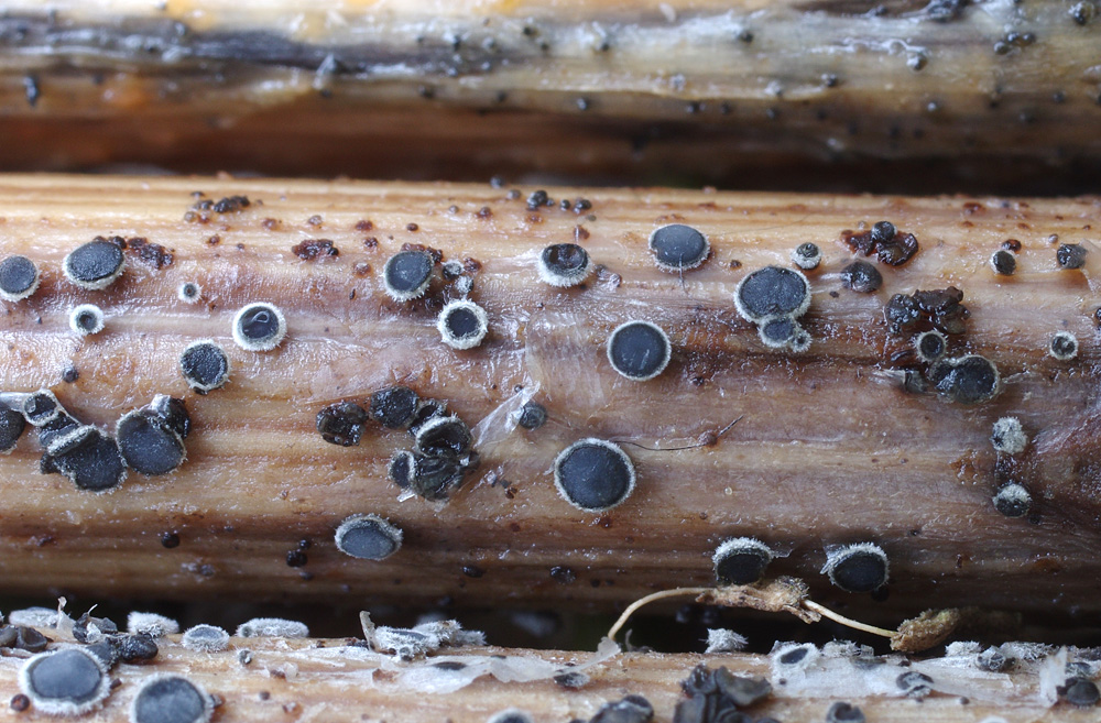 die Stängelchen lagen 14 Tage im Wasser, bevor die Aufnahme entstand. Ich vermute daher, dass es Schleim ist, der sich teilweise über das Substrat und über die Fruchtkörper gelegt hat. An einem anderen Stängel ist Leptosphaeria acuta zu sehen, der m.W. nur auf Brennessel vorkommt. Der Fund ist von 2013, leider ohne Exsikkat, daher sind Mikromerkmale nicht mehr nachlieferbar. Auch Jörg hat die von ihm gefundenen Fruchtkörper (bis dahin einziger Fund in Niedersachsen) als sehr hart empfunden. Außer Pyrenopeziza urticicola passt bisher keine andere Art auch nur annähernd.