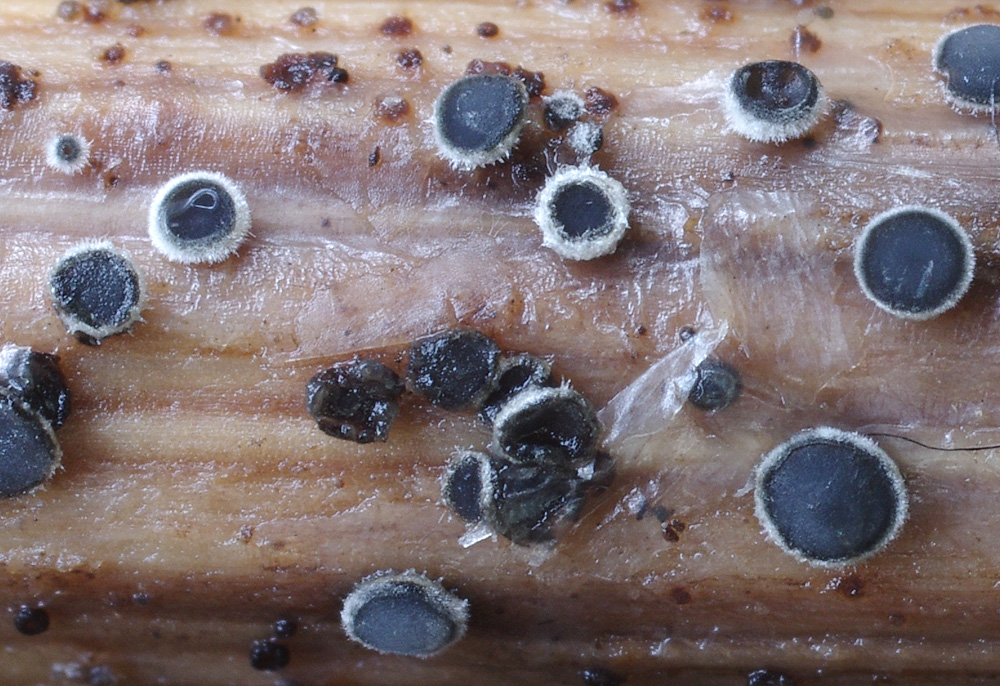 Die Haare waren alles andere als gelb, insofern tue ich mich schwer, das als T. mollissima zu bezeichnen. Die Apothecien waren dunkelgrau und sehr hart, Ascii an der Spitze mit Lugol blau, Sporen 8,5 - 10 x 1,5 - 2 µm, unseptiert