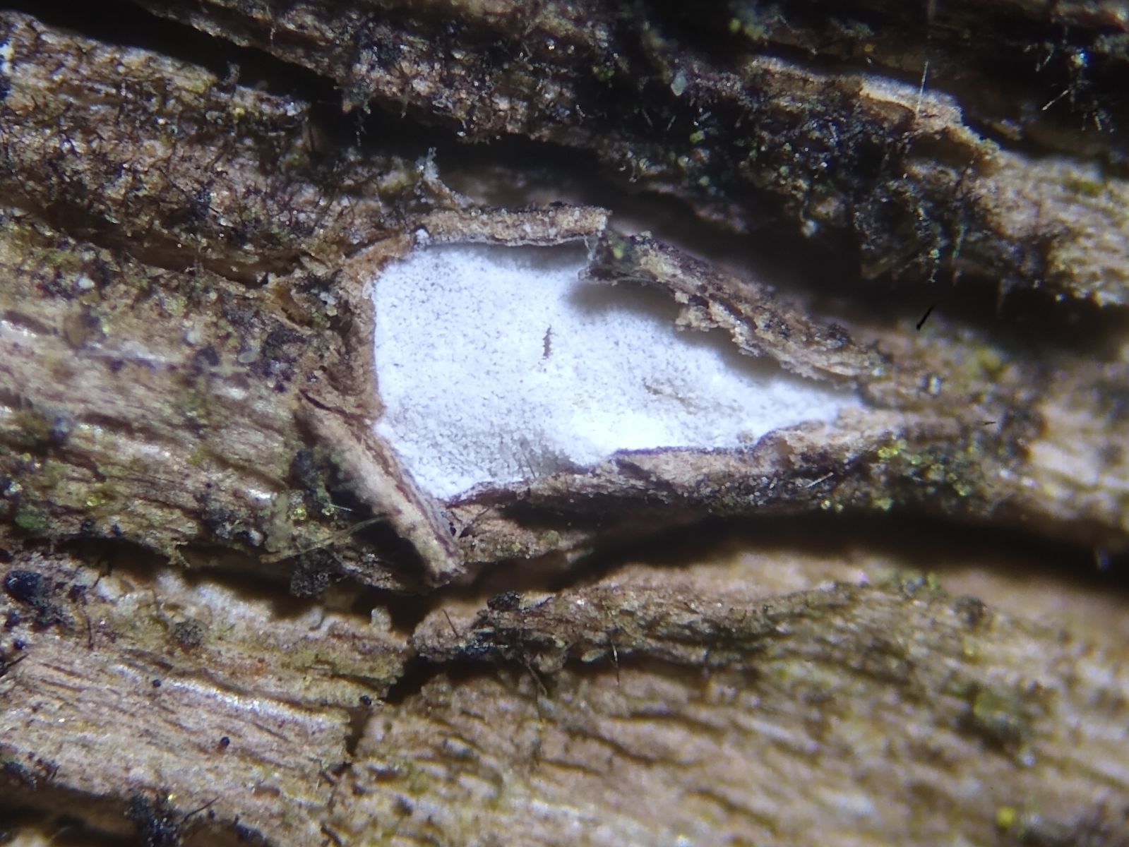 Man erkennt - eingebettet ins Holz - leuchtend weiße, aufgeplatzt wirkende, mehlige Flecken - Fructificationen des Pilzes.
