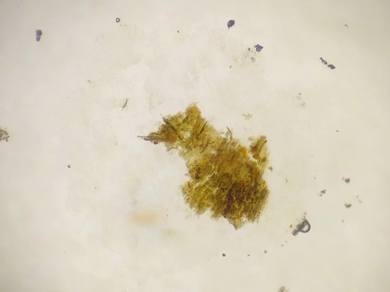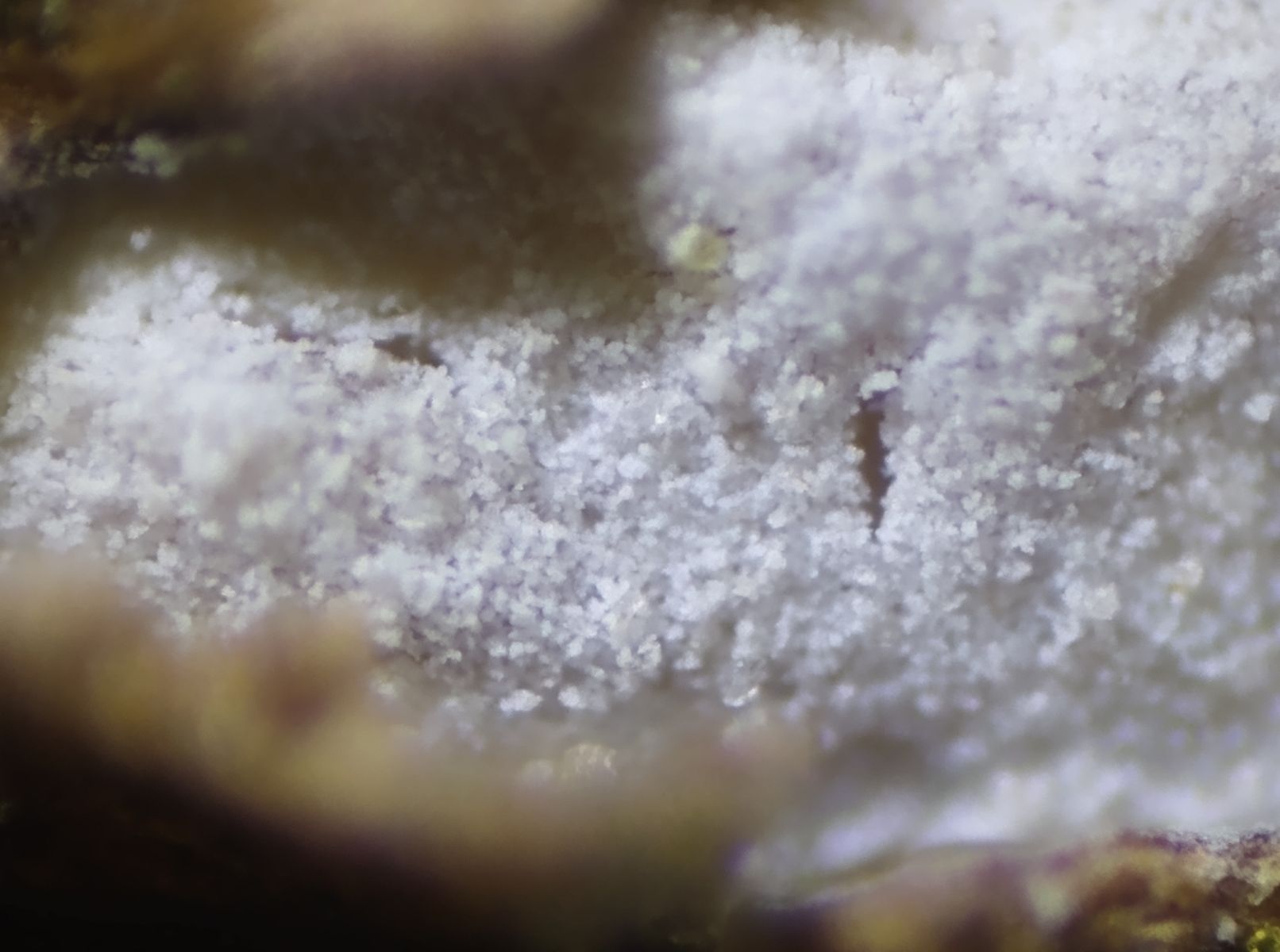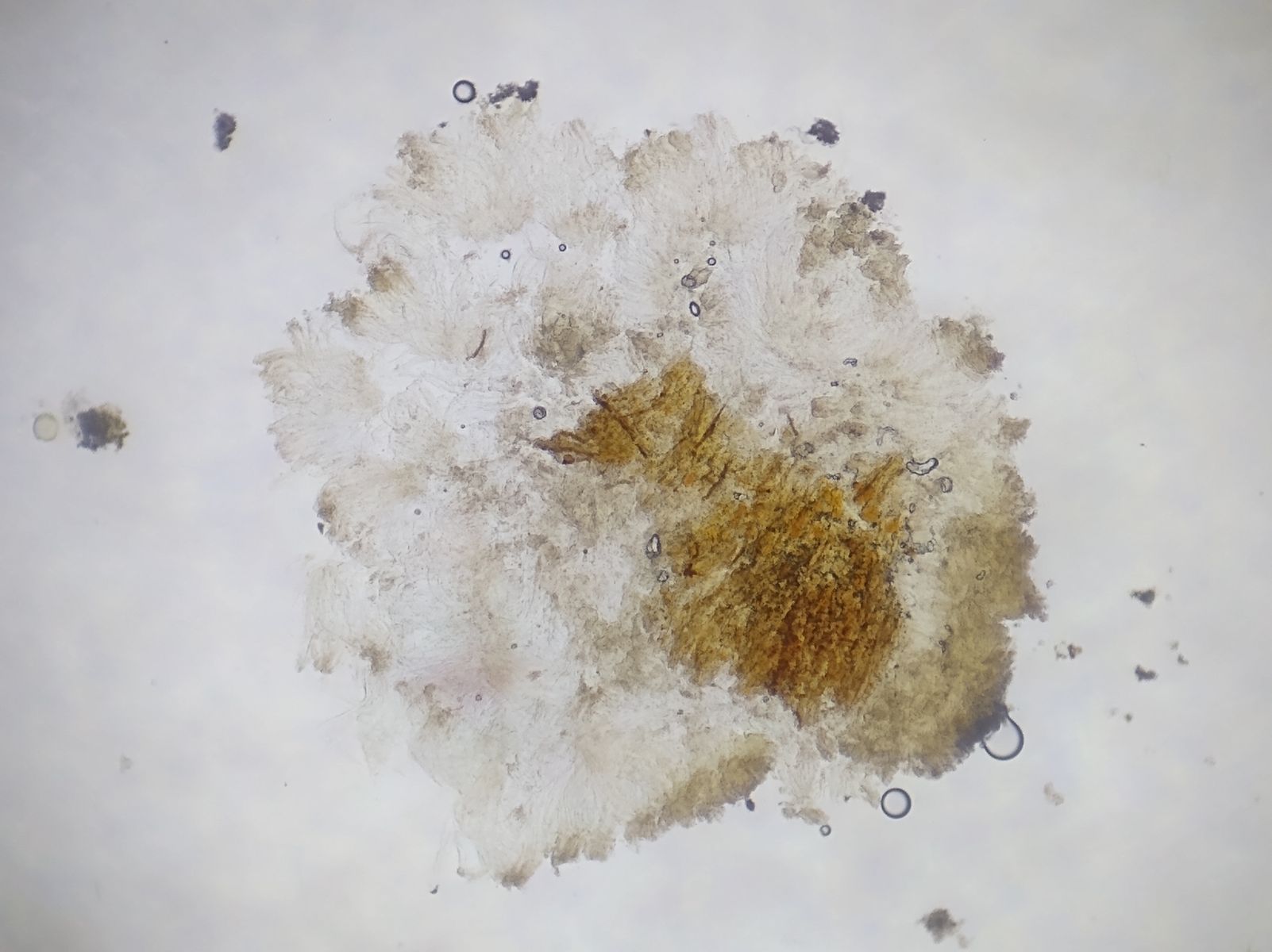 Bild 3 Zerdrückter Fruchtkörper mit graubrauner, wachsartig/kristalliner Masse, insbesondere am Rand; im Zentrum bräunliches Fremdmaterial