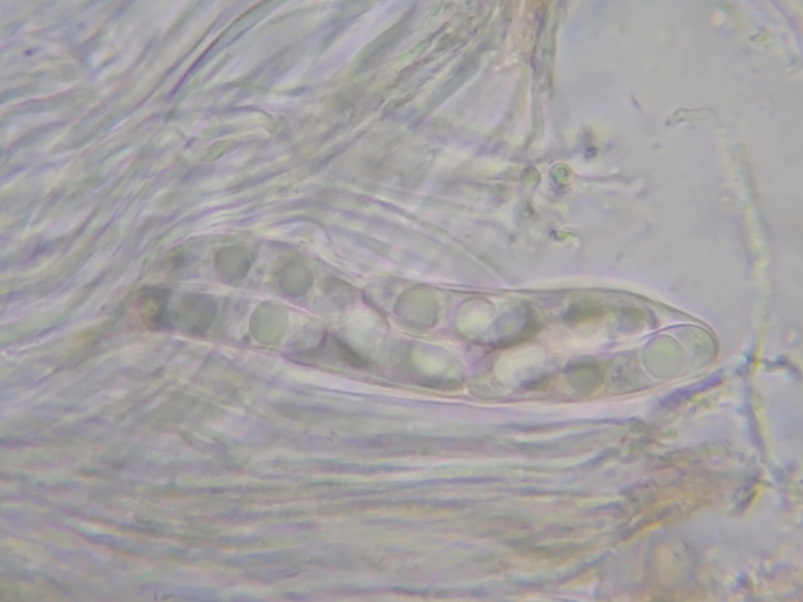 Die Schläuche sind 8-sporig, zweireihig angeordnet und über 100 µm lang, Durchmesser um 13 µm.