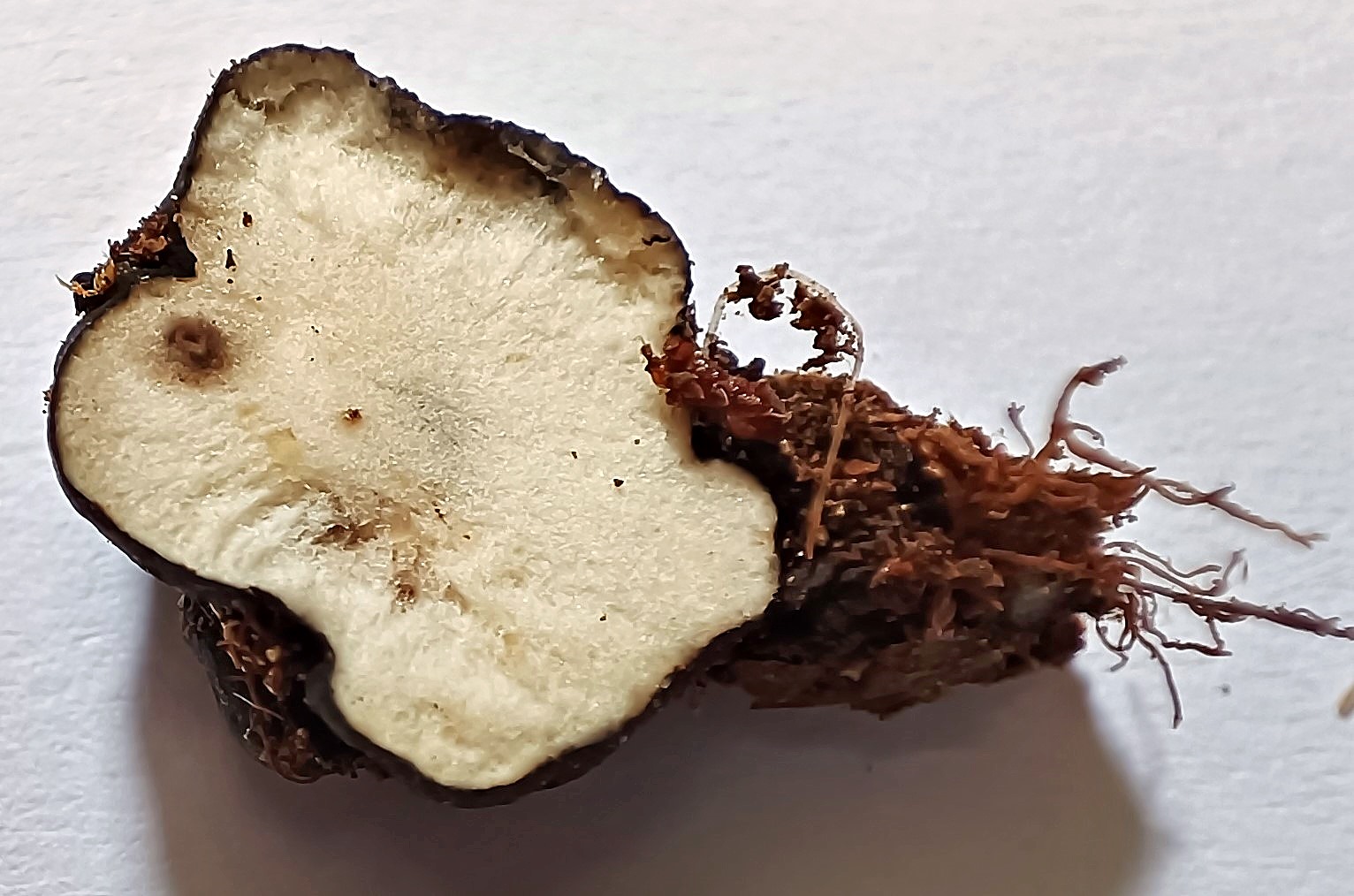 Erbensgroß, außen hartschalig schwarz, innen fast weiß, schwammig