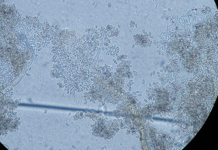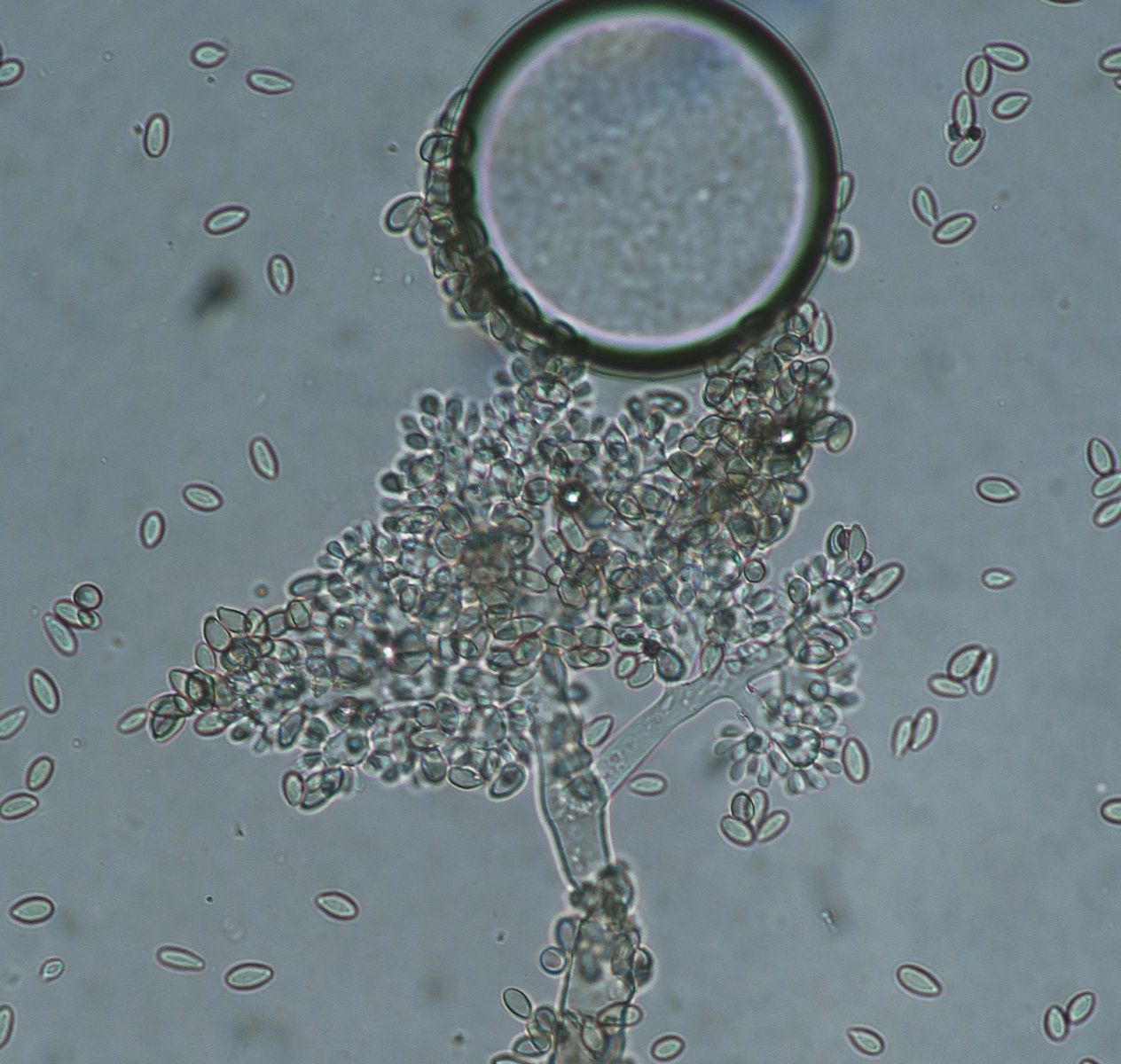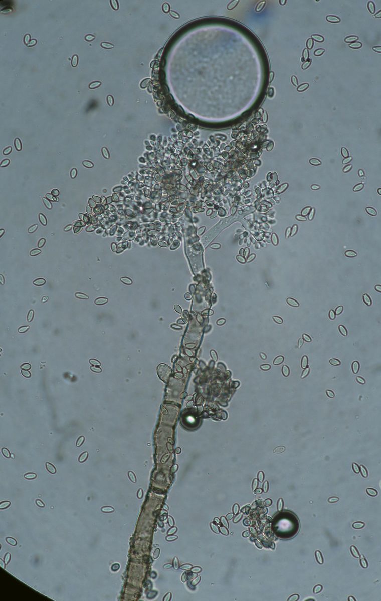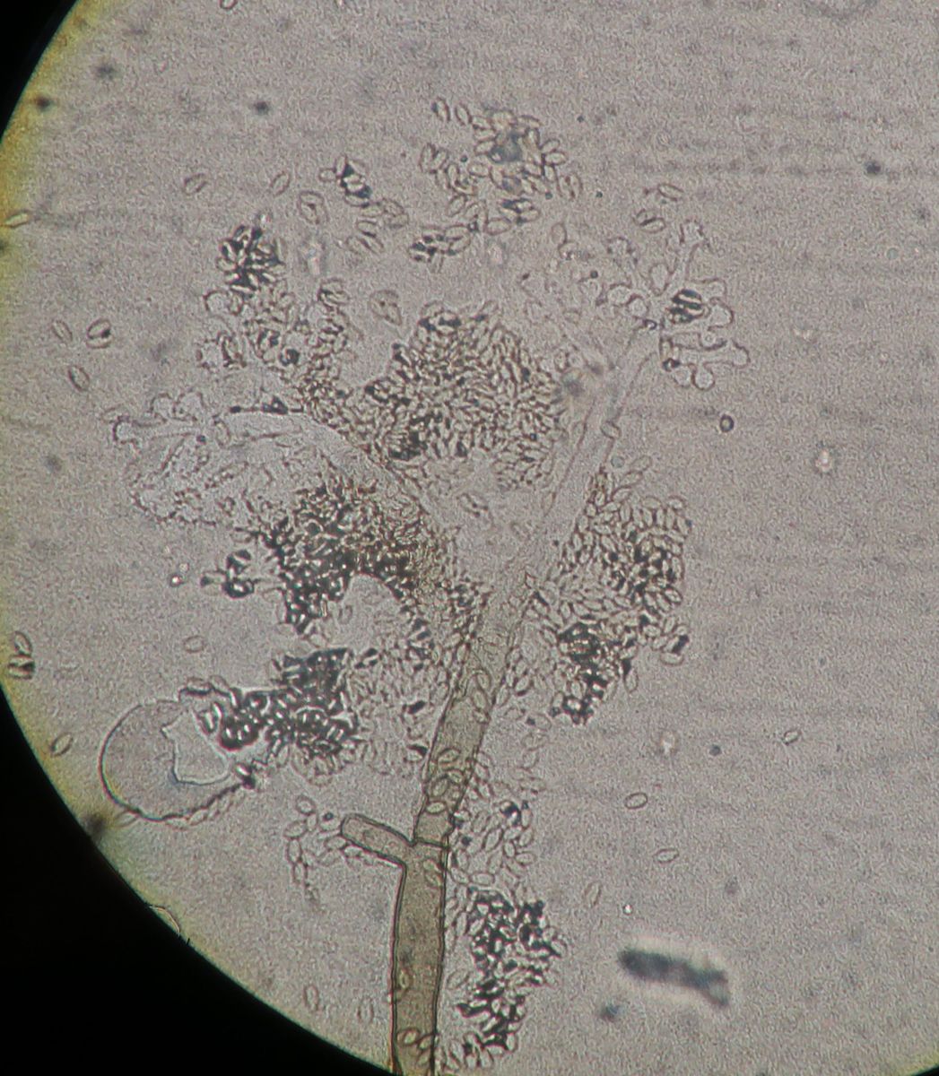 Today I spent some time checking some moulds that I have grown from random sources, including contaminants in previous isolations, air-borne spores, etc. More or less to self-educate. The one I am posting about should correspond to a Botrytis sp. Colonies are pale greyish with a hint of olive-brown hue or greenish in LED light. AT first, I thought I was examining B. cinerea, the common botrytis, but on consulting some books, the species is likely to be B. aclada or B. allii (the paper below recognizes both species as valid) and both are distributed worldwide and closely related to each other. The spore size may tell them apart.