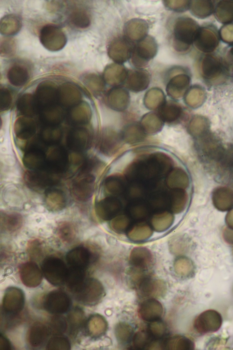 8-sporig , Intakte Sporen nur in einem Ascus gefunden Masse: 21,4 - 23,3 x 5,7 - 6,1