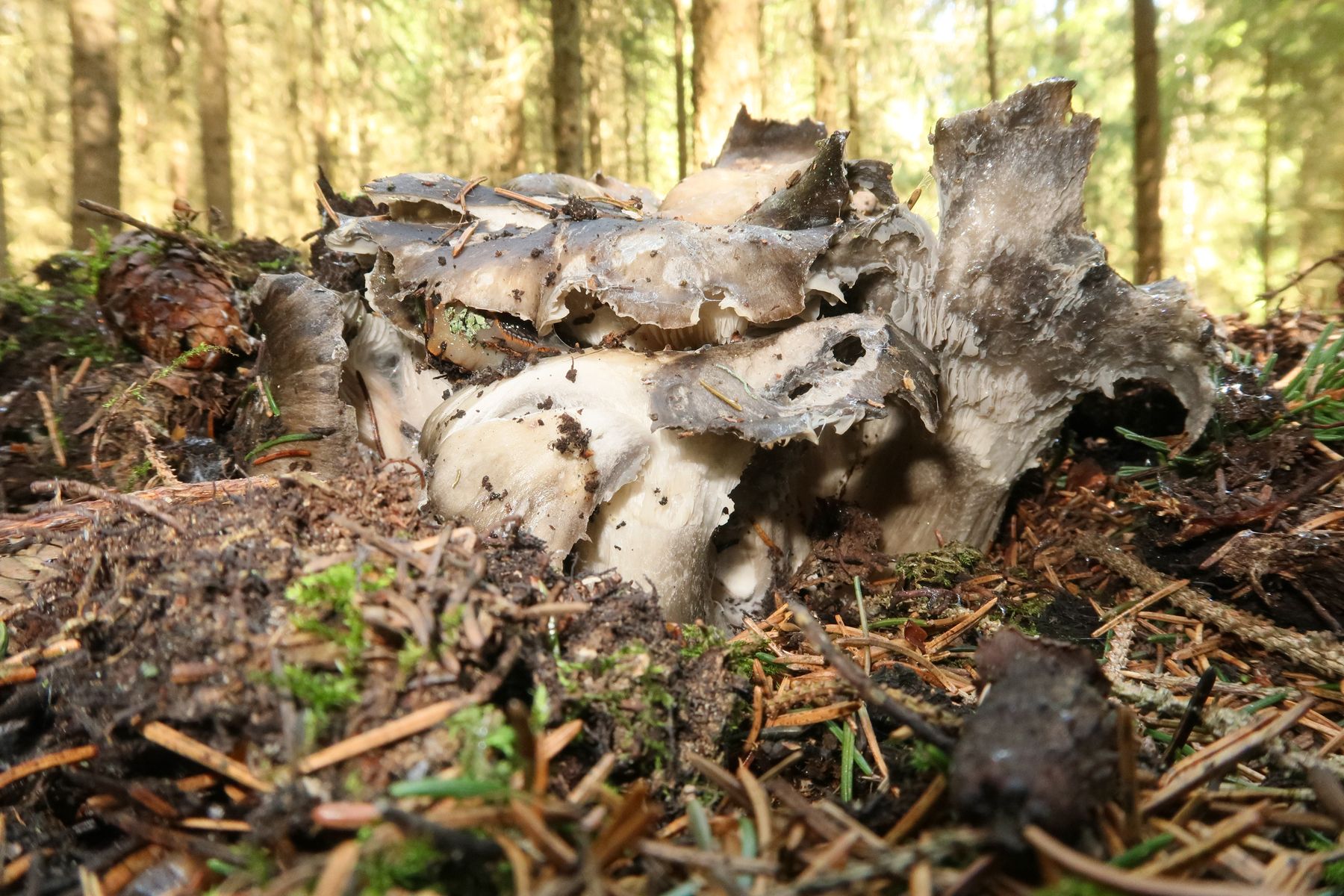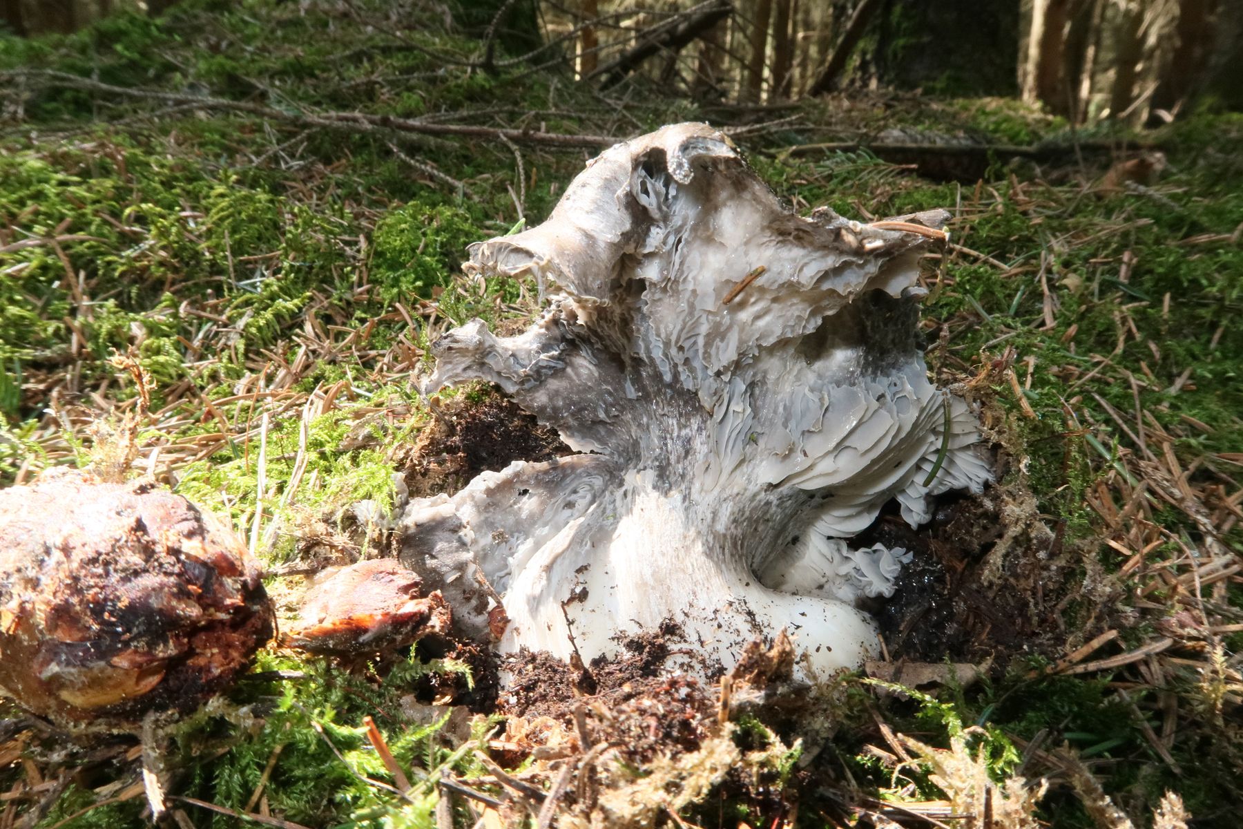 Sehr schön zu sehen, wie sich die Pilze entwickeln. Es wird im Boden der Hut ausgebildet, und dann durch Wachstum des Stieles alles nach Oben geschoben. Das das natürlich auf Grund von Ästen, Zweigen, Wurzeln Probleme macht, ist klar. Man erkennt das sehr gut daran, welche Substratbewegungen dabei vollzogen werden. Siehe Bild unten; die Gruppe.