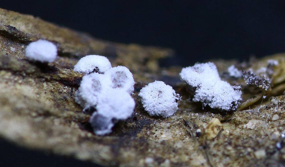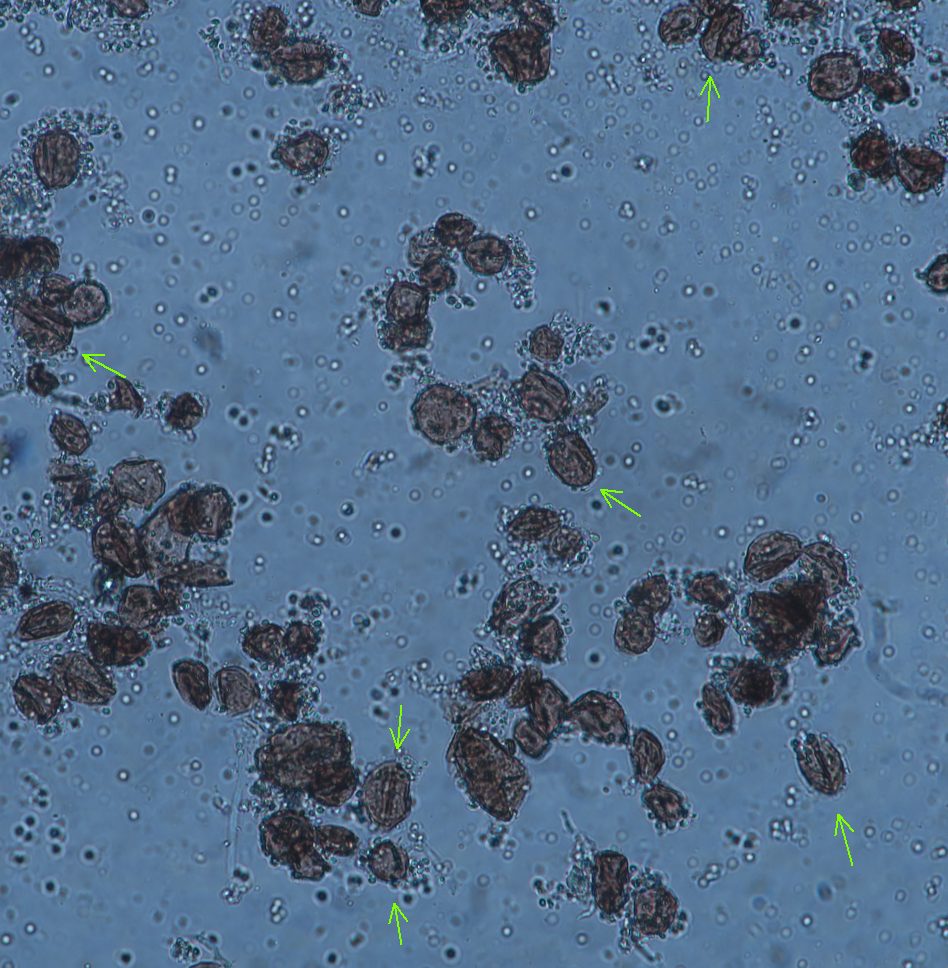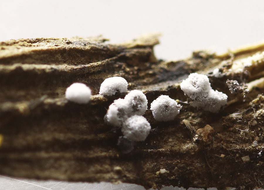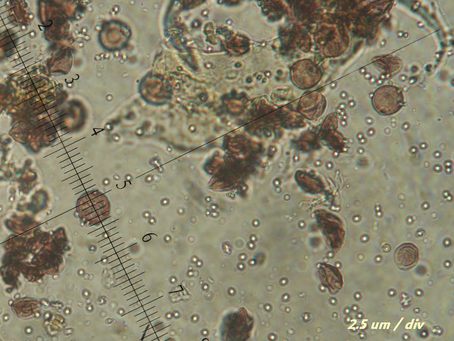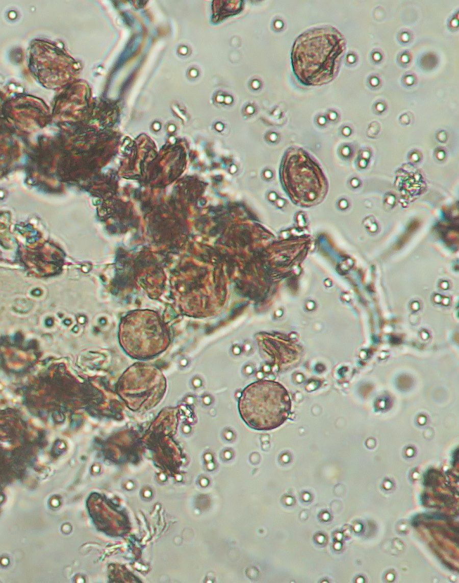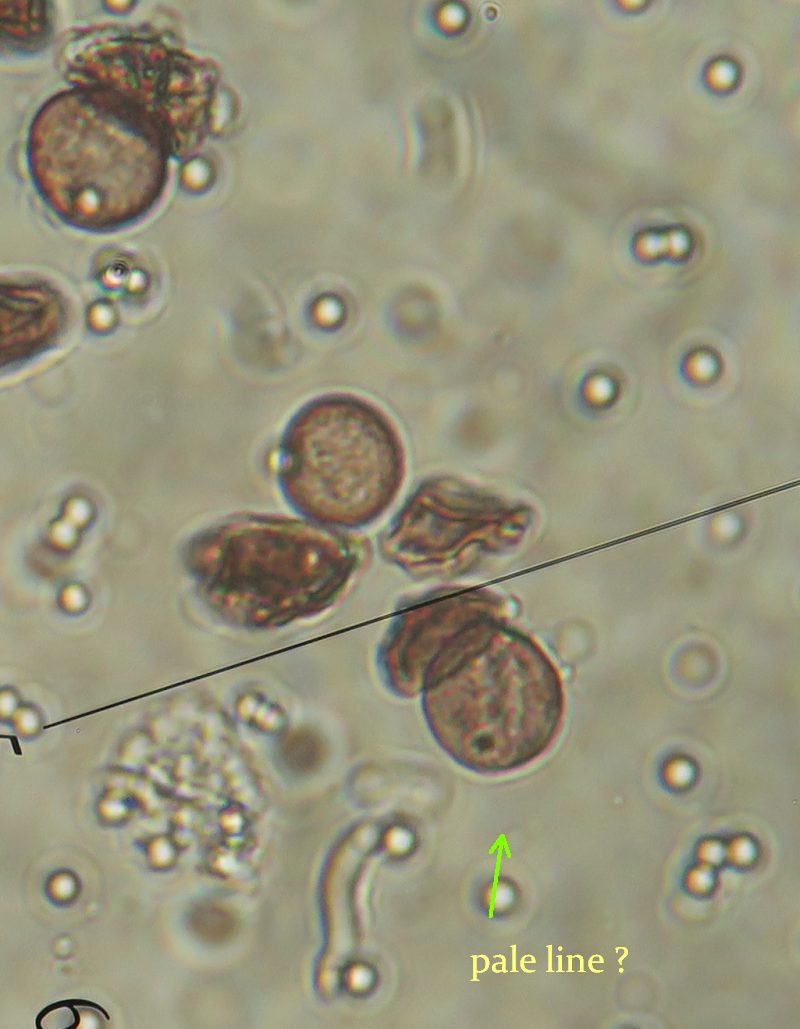 Here is another Physarum on decaying plants which I am trying to identify. I only have about 15 fruiting bodies (maybe more will grow) and they are old I think. The myxocarps are very rich in lime almost fluffy, the spores are like collapsed but few were examinable and are round to slightly oval, not ornamented and unless it is my imagination, i am seeing a faint line across some. Those which are starting to collapse or shrivel show this line stronger (line of weakness ?). The lime nodules are chunky and quite rounded at edges. Spores 11-12 um (so it fits too). I am sorry that I do not have better material!