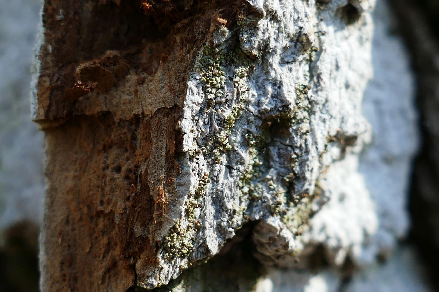 Auf den weiß überzognen Borkenschuppen sind bei genauer Betrachtung grünliche Bereiche mit stecknadelförmigen Fruchtkörpern erkennbar.