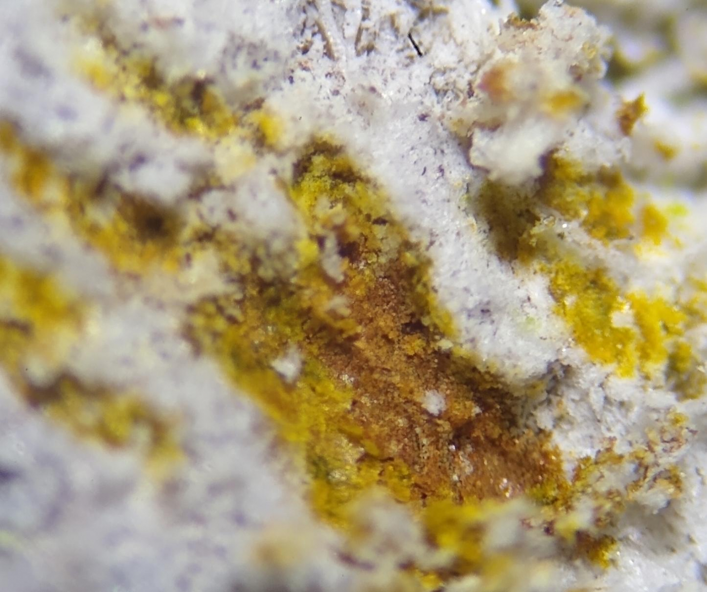 Der weiße Thallus bricht stellenweise grünlich-leprös auf (oder sitzt der grünliche Thallus auf einem weißlichen Fremd-Thallus auf ?