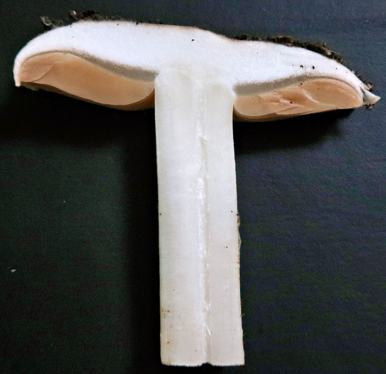 Gesamtbild, hinten links unter dem Pilz sieht man die Sporenfarbe: