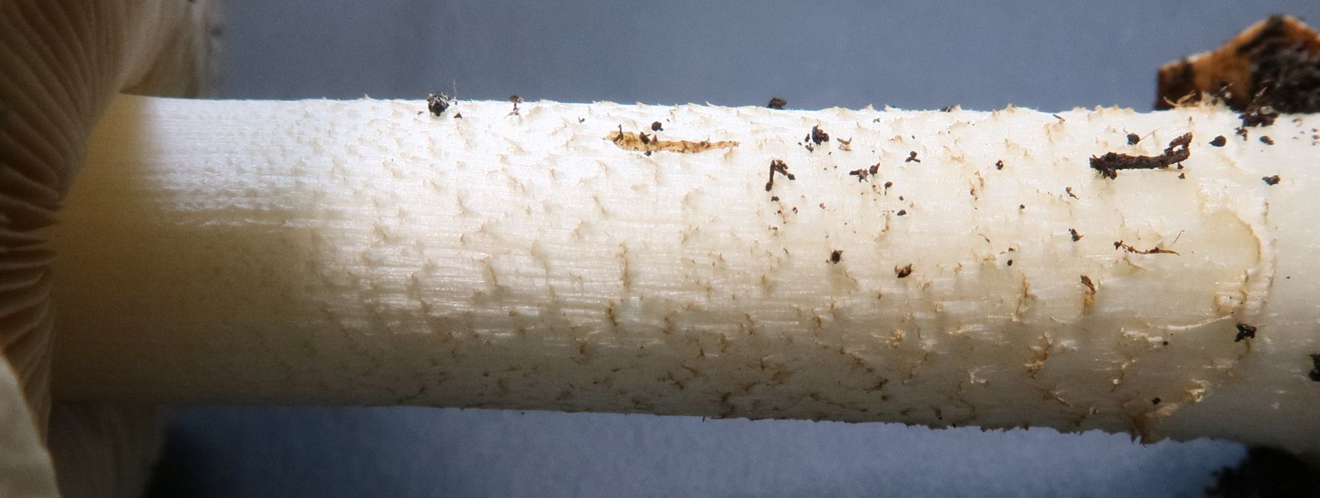 Stiel: fest, längsfaserig, am Hutansatz ca. 1cm lang deutlich gestreift, ab dann nach oben zeigend geschuppt