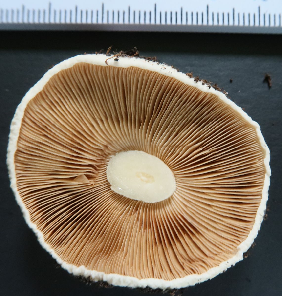 Gesamtbild, hinten links unter dem Pilz sieht man die Sporenfarbe: