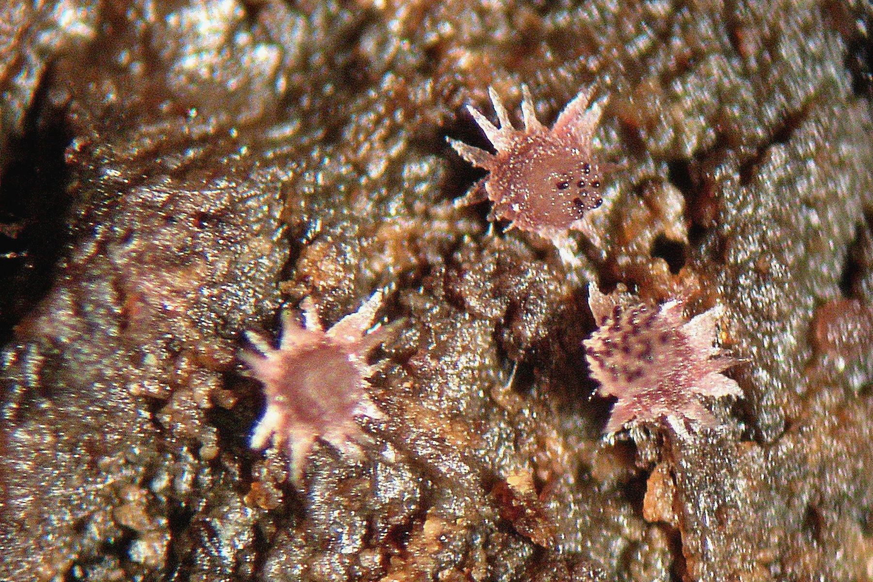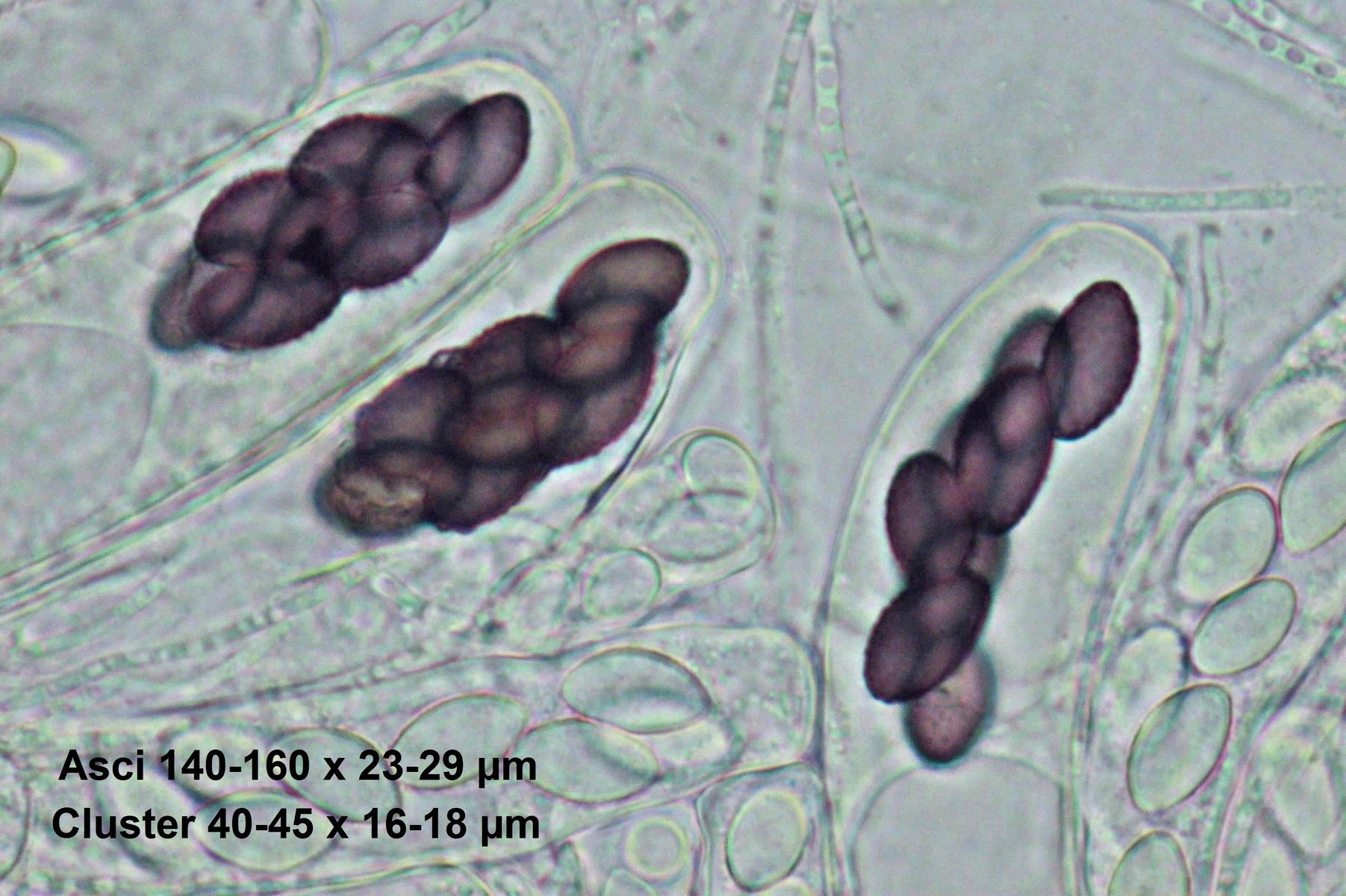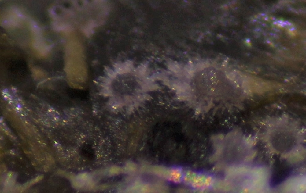 Auffallend waren die stark zusammengeklebten Hyphen an dem Fruchtkörper, der makroskopisch wie ein kleiner Kronenkranz aussieht. Die Fruchtkörper waren weißlich bis leicht violett. Die Sporencluster gingen von ca. 40-43X14-16; die einzelnen Sporen maßen 16,5-17,5X8-8,5.