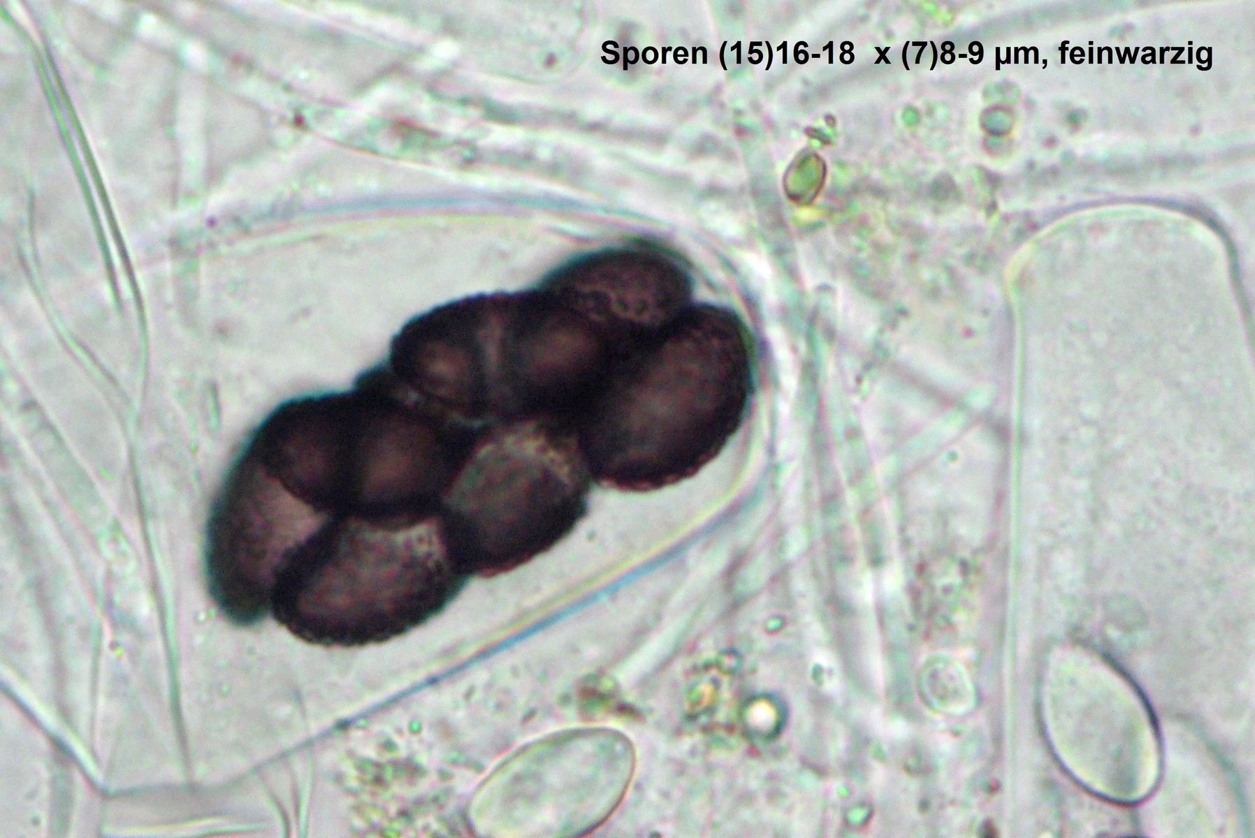 Die Sporengröße und ~oberfläche, die Größe sowohl der Sporen als auch der Cluster sprechen klar für diese Art.