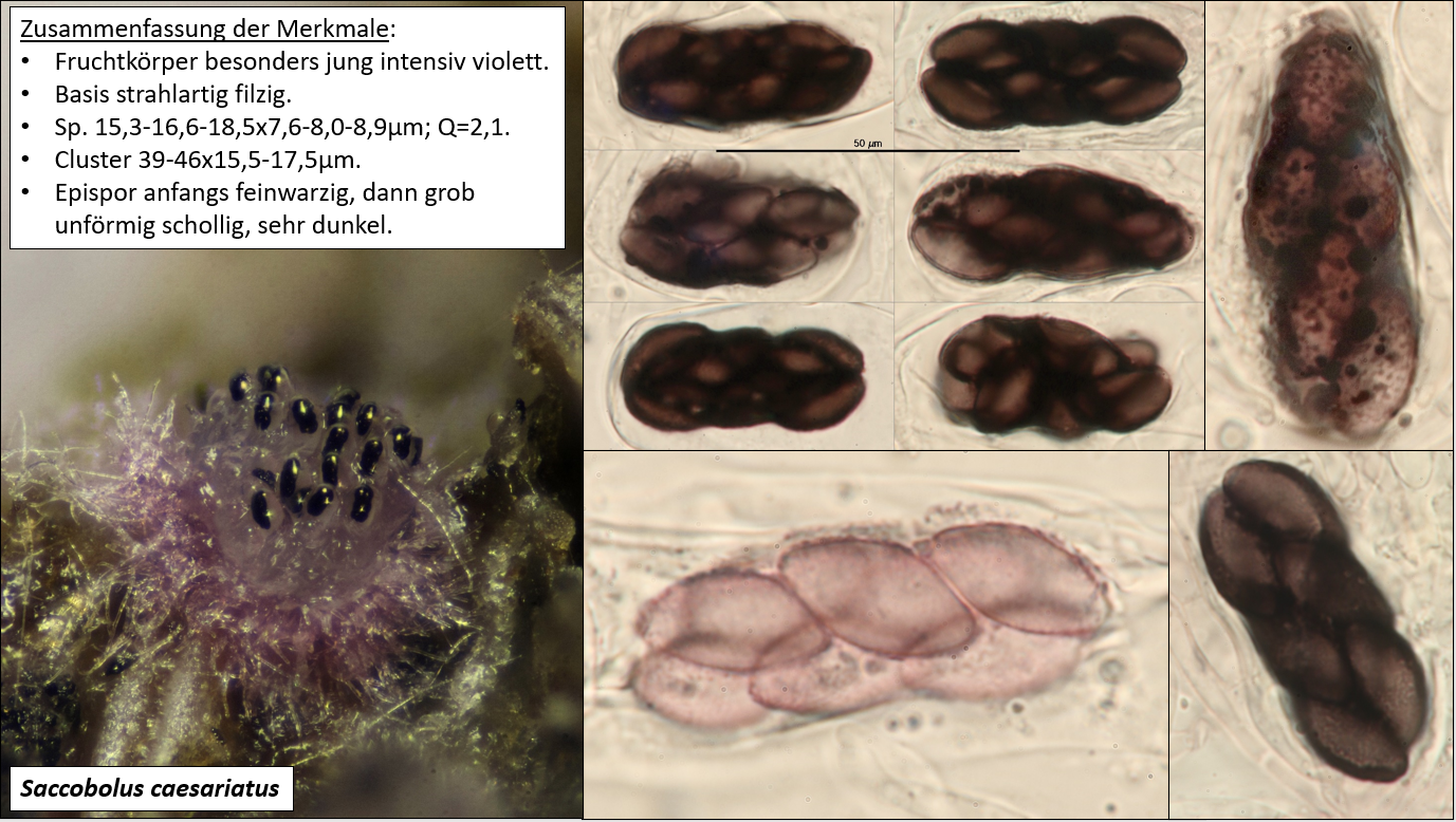 ich habe meine Zweifel daran, dass der von Matthias gezeigte Fund tatsächlich der S. caesariatus ist, den du selbst zeigst bzw. der in dem Artikel gezeigt wird. Die Sporen passen nicht dazu und für S. caesariatus wird das "contrating" des Sporenclusters nicht beschrieben (was bei Matthias Aufsammlung aber zu sehen ist). Auch wenn der Pilz makroskopisch gewisse Ähnlichkeiten zeigt, so scheint er mikroskopisch doch deutlich abzuweichen.