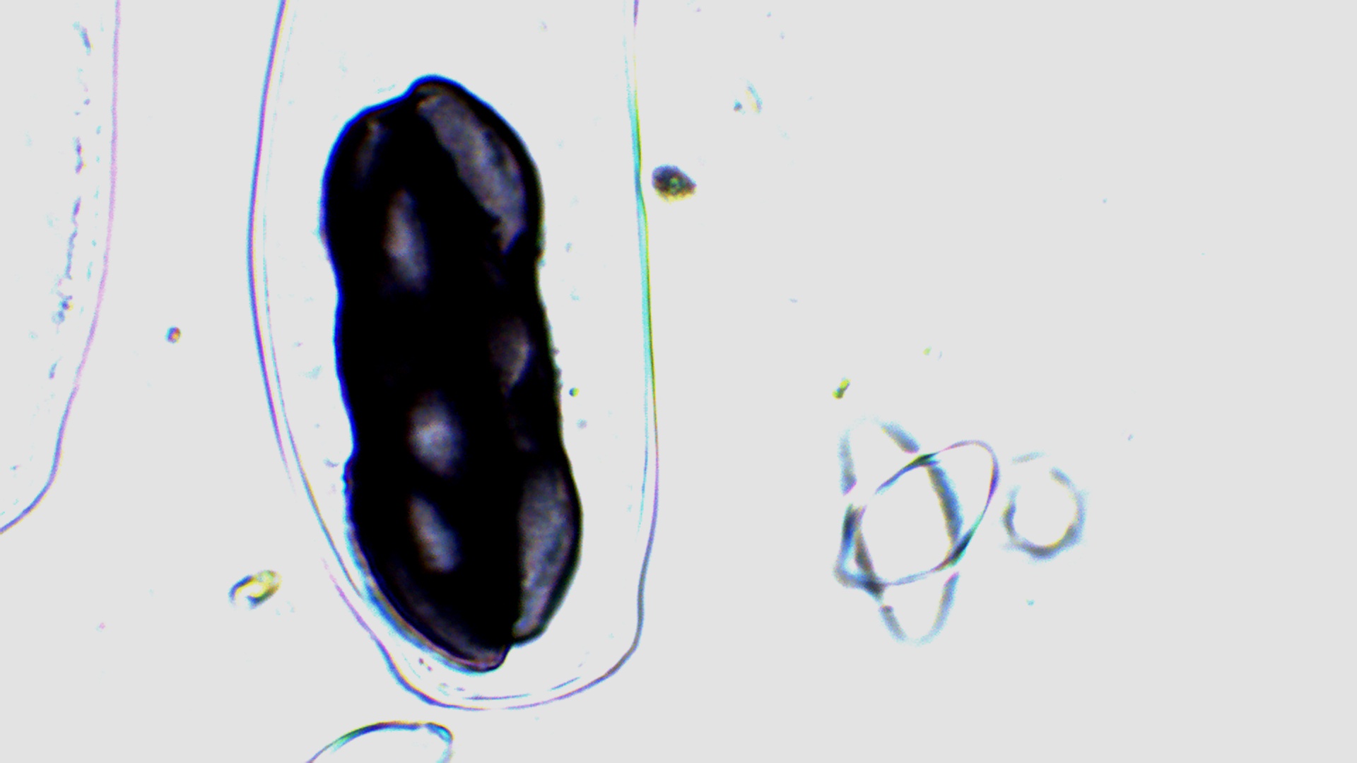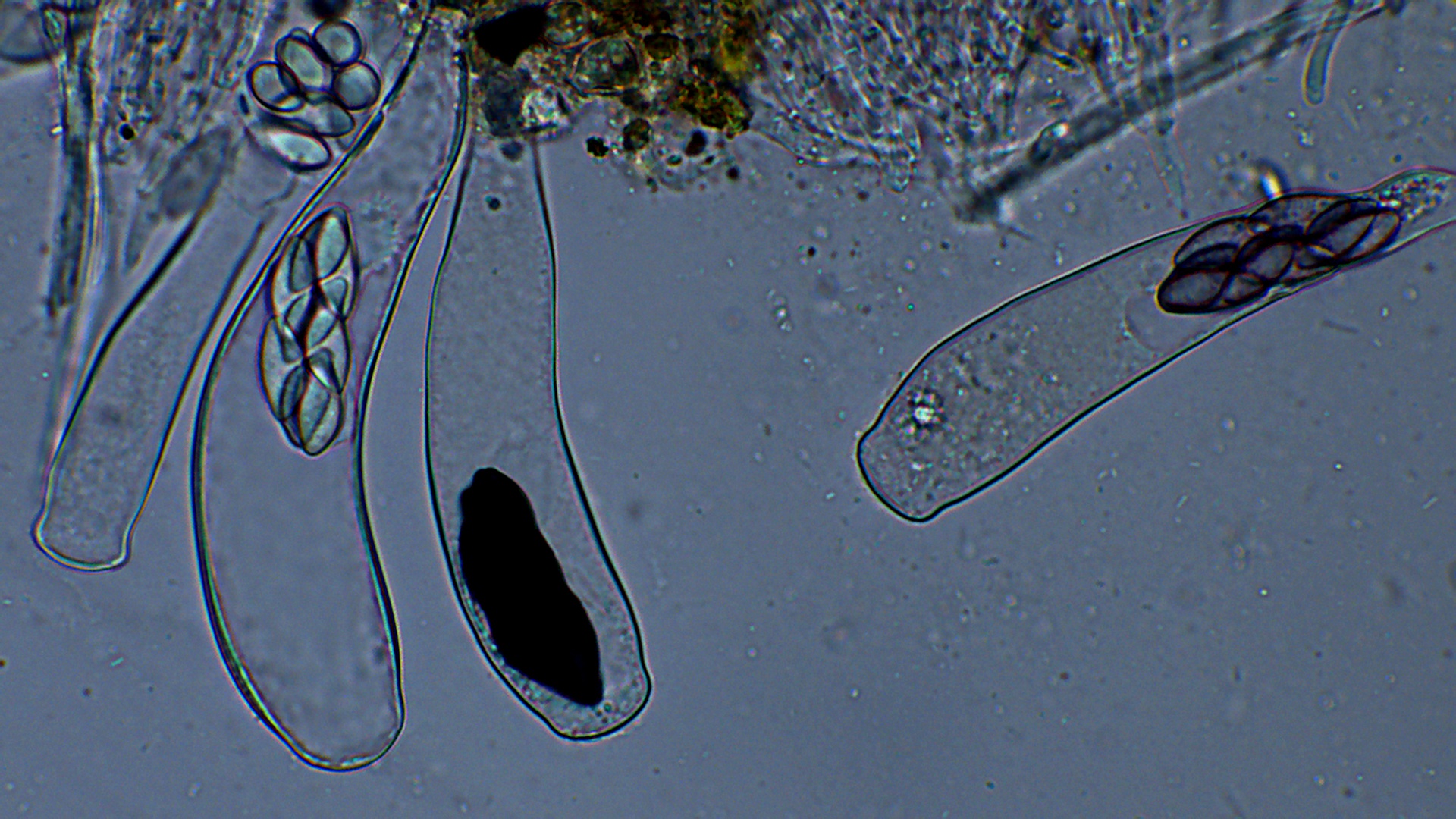 Auffallend waren die stark zusammengeklebten Hyphen an dem Fruchtkörper, der makroskopisch wie ein kleiner Kronenkranz aussieht. Die Fruchtkörper waren weißlich bis leicht violett. Die Sporencluster gingen von ca. 40-43X14-16; die einzelnen Sporen maßen 16,5-17,5X8-8,5.