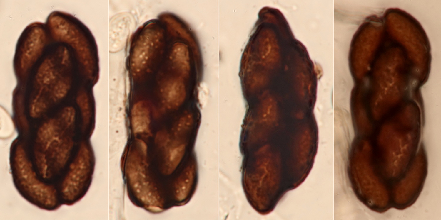 Auffallend waren die stark zusammengeklebten Hyphen an dem Fruchtkörper, der makroskopisch wie ein kleiner Kronenkranz aussieht. Die Fruchtkörper waren weißlich bis leicht violett. Die Sporencluster gingen von ca. 40-43X14-16; die einzelnen Sporen maßen 16,5-17,5X8-8,5.