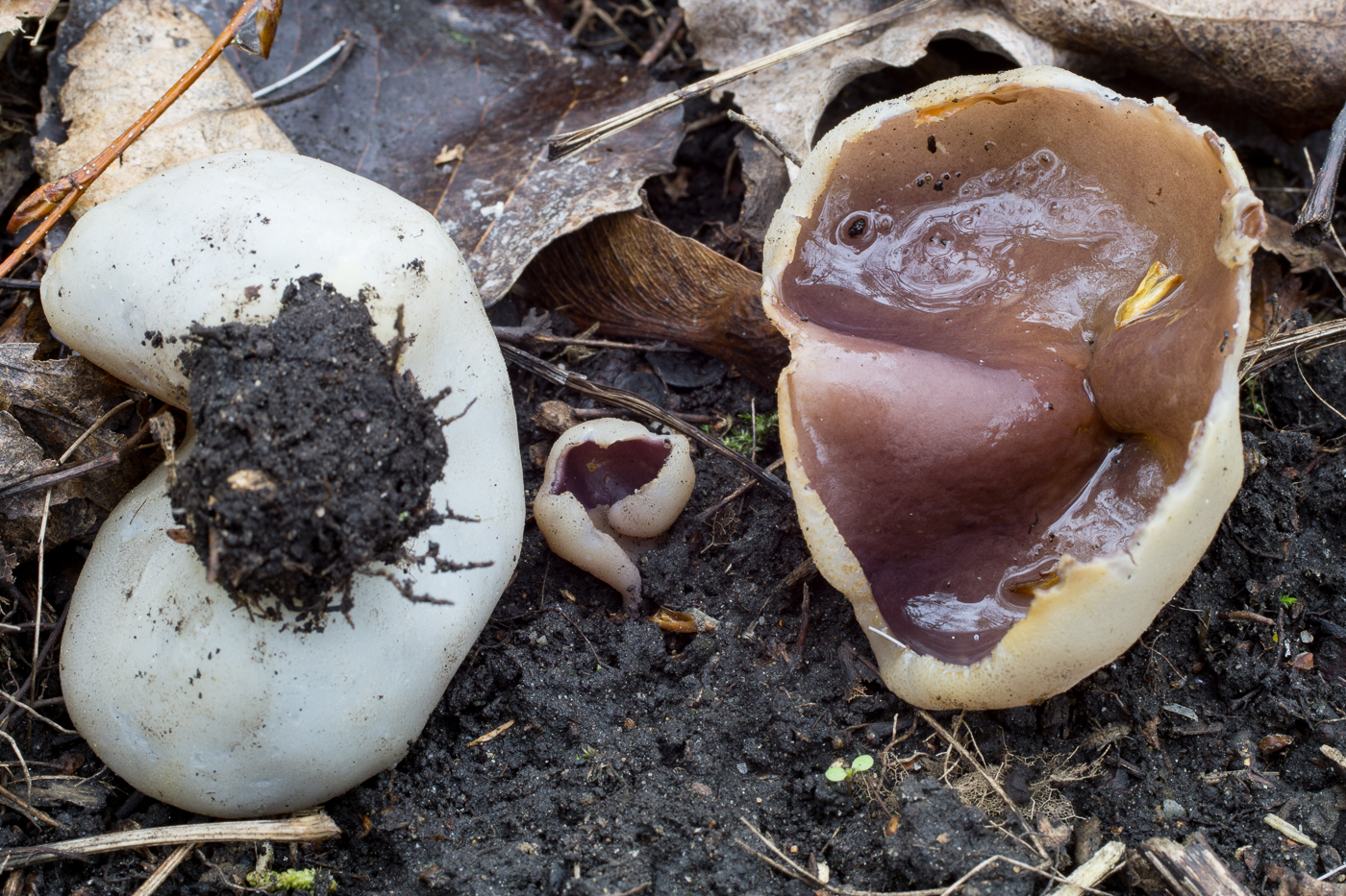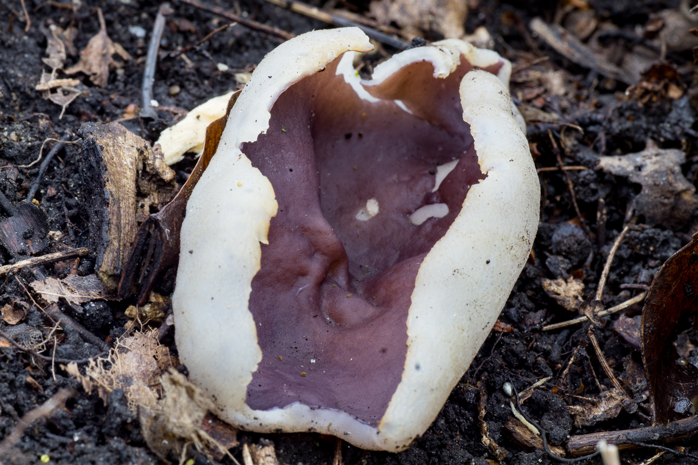Nummer 2 waren diese hübschen violetten Becherlinge. Auch sie zum Teil relativ groß, so bis ca. 7cm. Allerdings alle am Boden wachsend (neben den Morcheln, also wohl kalkhaltig). Keine Brandstelle so weit ich sehen konnte, keine "Milch" oder gelben Verfärbungen. Hatte gehofft es gibt vielleicht nicht so viele violette aber scheinbar gibt's da doch ein paar. Vermutlich ebenfalls mikropflichtig also?