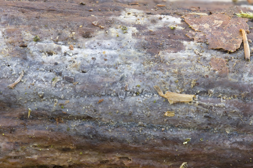 auf Grund der makroskopischen Merkmale und der Sporengröße und -form, halte ich das für Phlebiella (Xenasmatella) tulasnelloidea, wie Andreas schon angedeutet hat.