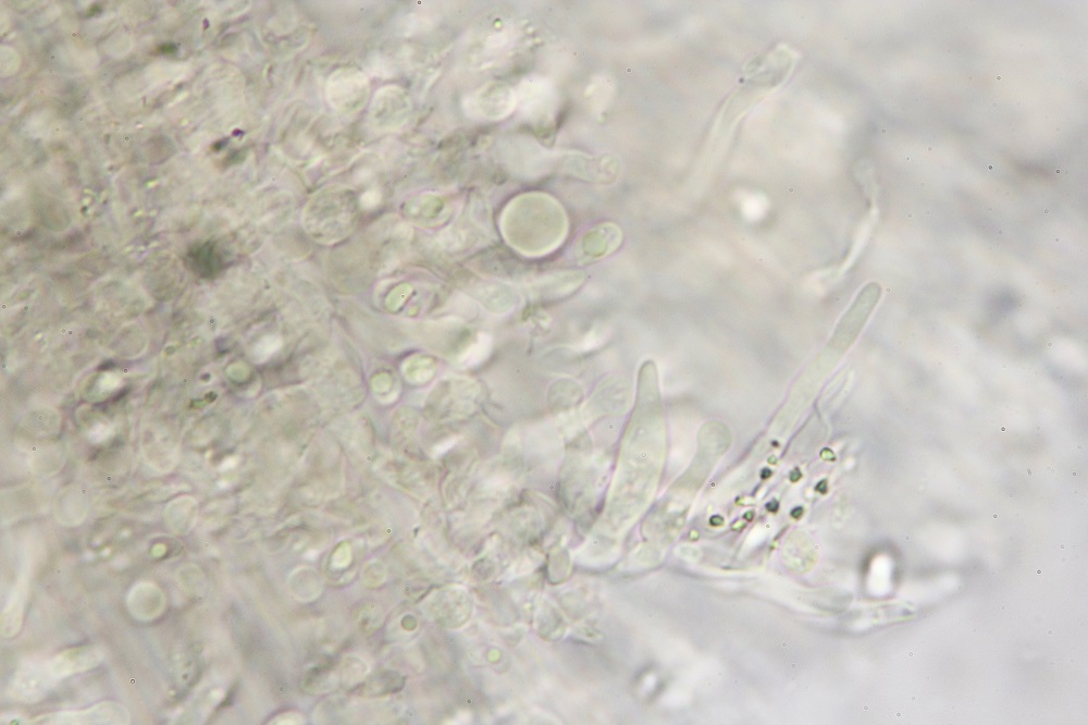 Irgendwie würde ich bei der Porenform und der "Zystiden"form schon fast eher an Schizopora flavipora denken - aber die Poren und Sporen sind mir dafür eigentlich zu groß.