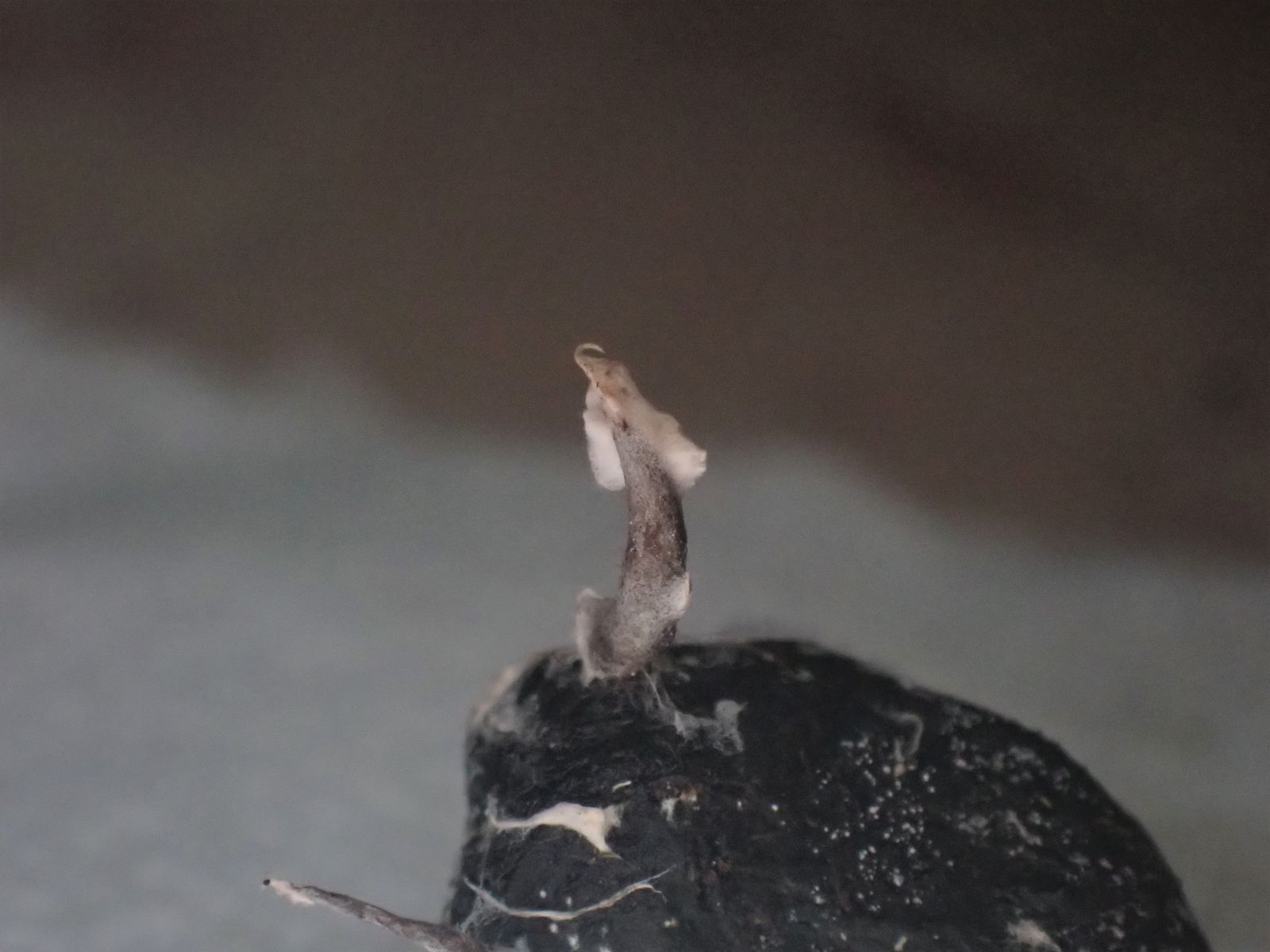 auf einem Dungstück vom Damwild wächst bei mir momentan etwas recht Seltsames. Irgendwie keulenartig, aber ich habe auch den Verdacht, dass es vielleicht dank der Feuchtkammer etwas ist, dass gerade so wächst, wie es vielleicht nicht wachsen sollte. Nunja, ich stelle es mal hier auf gut Glück ein, vielleicht hat ja von euch jemand eine Idee. Eine kleine Spitze habe ich abgezwackt und unters Mikro gelegt. Die Bilder füge ich auch an.