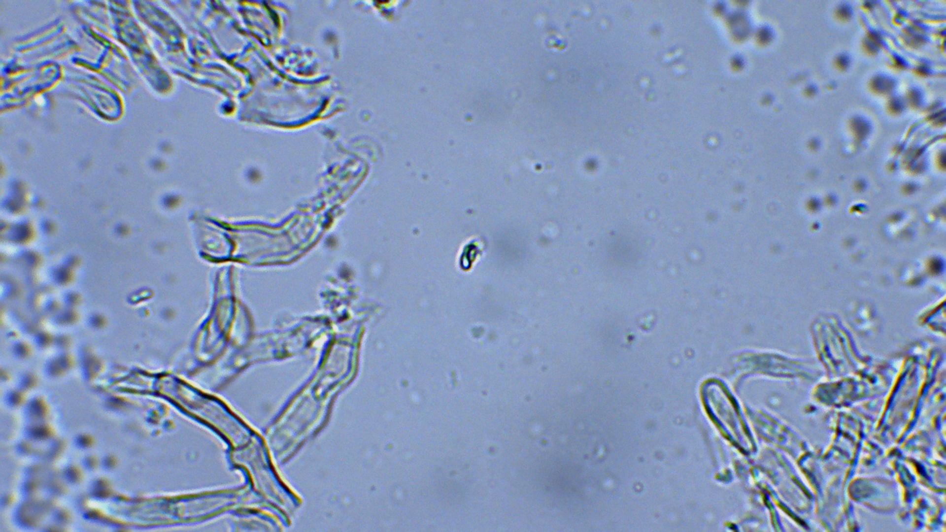 ich habe mir noch einmal den Fruchtkörper angeschaut und auch die anderen Dungstücke, die in dem Döschen sind. Auch dort wachsen keulenartige Strukturen, die allerdings wirklich keulenförmiger sind. Ich habe noch einmal ein kleines Stückchen des Fruchtkörpers, der oben zu sehen ist, unters Mikro gelegt und war erstaunt, dass es wohl ein Basidiomycet ist. Ich würde nun mal die Gattung Typhula in den Ring werfen.