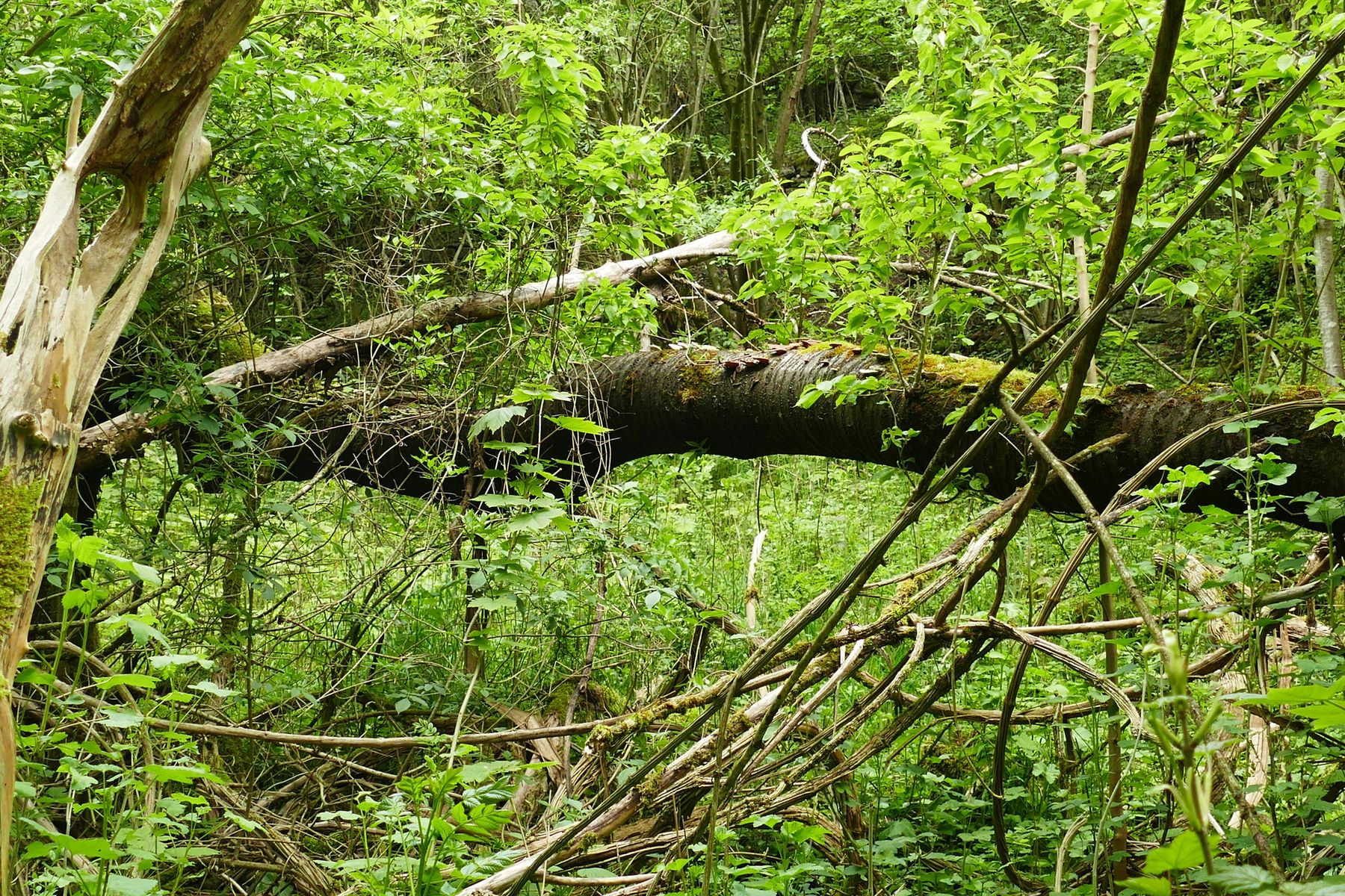 Heute bin ich in einer feuchten und eher schattigen Klinge (Bachtal) auf einen umgeknickten Kirschbaum aufmerksam geworden, der auf der Oberseite trametenförmige Fruchtkörper aufwies.
