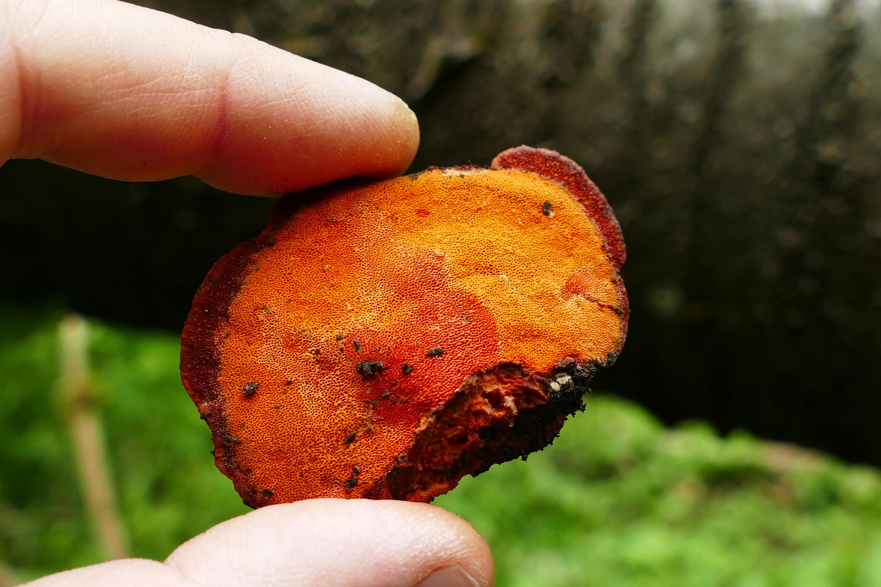 Pycnoporus cinnabarinus kann scharlachrote runde (bis irreguläre) Poren haben, aber mag wohl sonnenexponierte Orte.