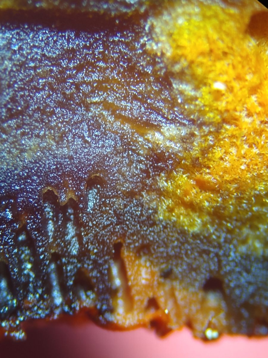 Der Zusatz von 3%iger KOH zum Querschnitt lässt die Probe kräftig gelb auslaugen.