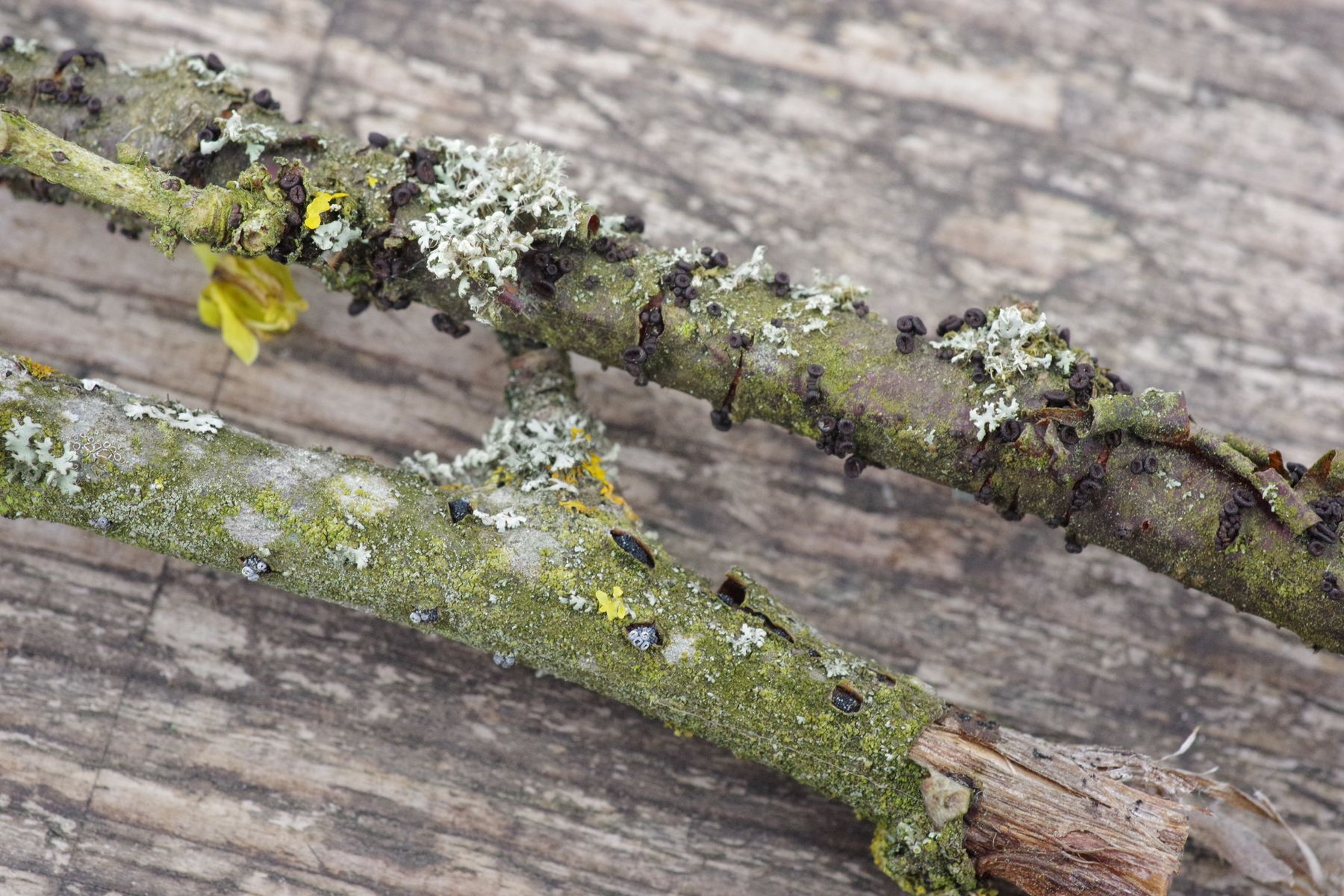 Vorjährige Tympanis an Apfel, wo mittlerweile die Rinde schon teils abgefallen ist.