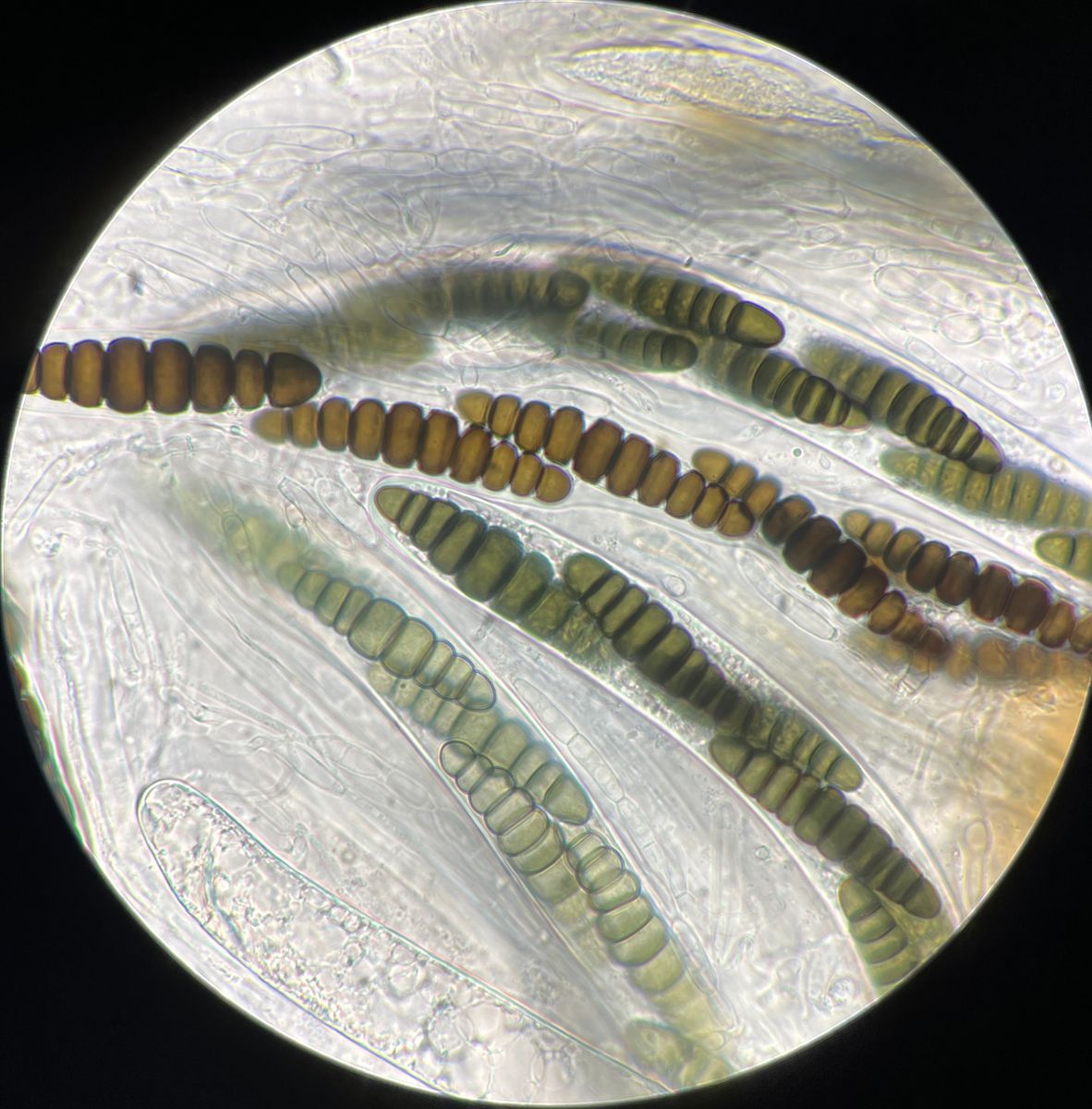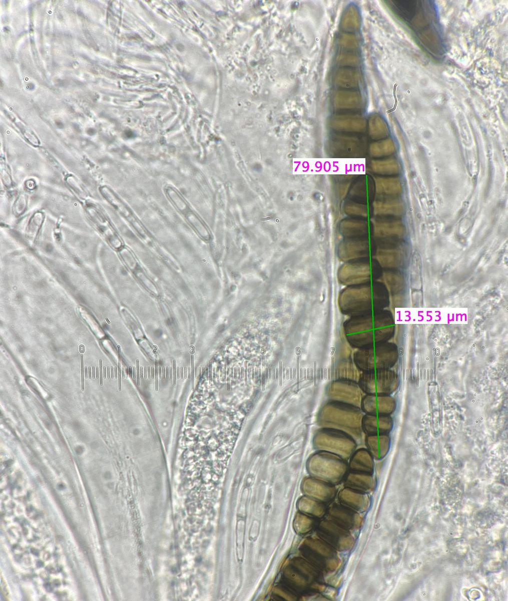 Es sind ganz ab und zu auch elfzellige und zwölfzellige Sporen dabei (was ja laut Ahmed und Cain für S. calomera passen könnte). Diese sind bis zu 80x13.5µm groß. Allerdings sind immer Haare an den Mündungen von den Perithecienhälsen (bis zu 100µm lang) und das passt dann nicht mehr zur Beschreibung von S. calomera. Passt aber gut zur Beschreibung von Preussia octosymmetrica die vor kurzem aufs Forum hochgeladen wurde.