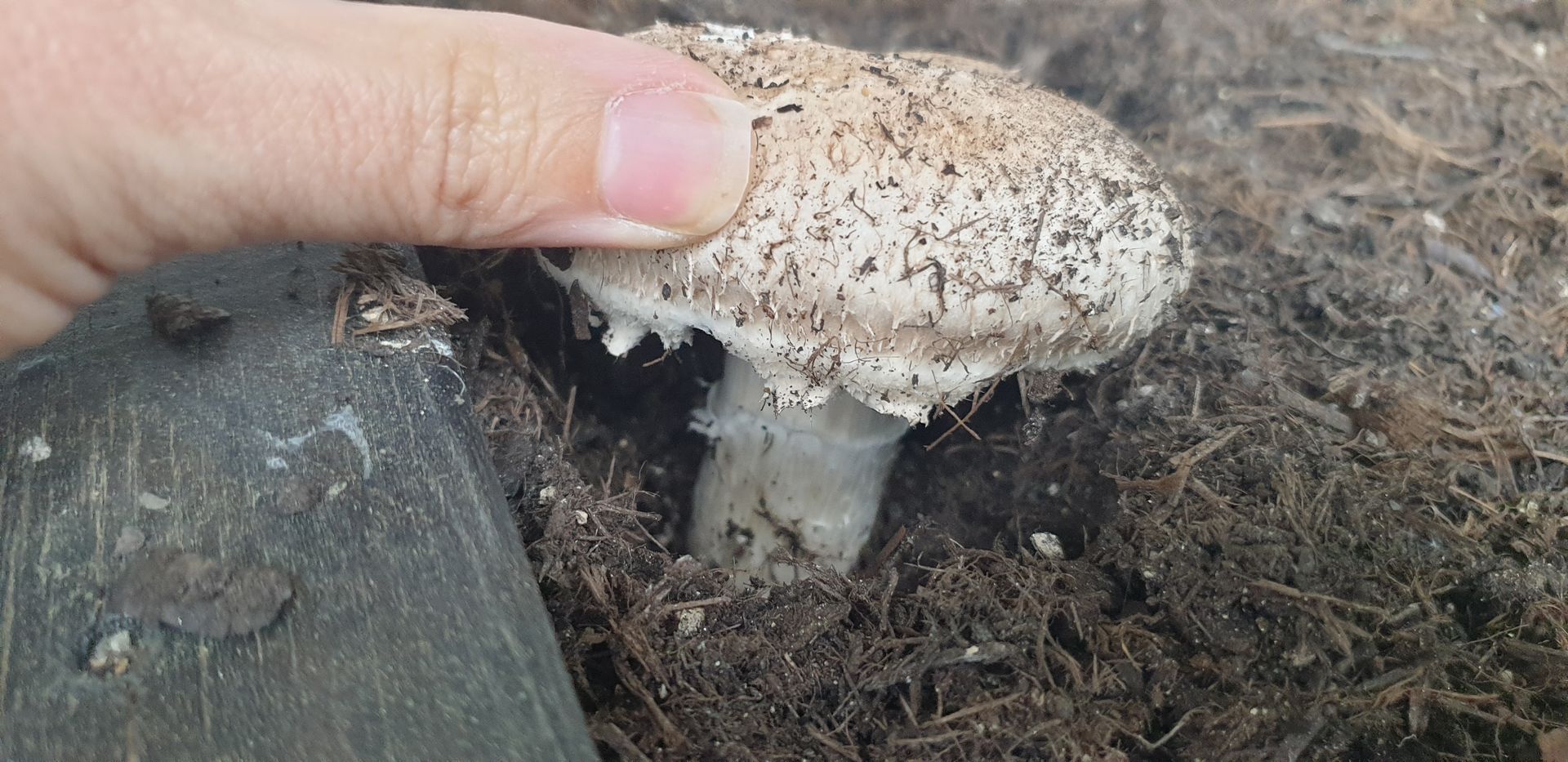 Ich habe in meinem Hochbeet eine Wurmkiste, in der ich seit MĂ€rz u.a. auch Champignonreste entsorge. Nun habe ich gestern in meinem Hochbeet, gleich neben der Wurmkiste, diesen Champignon entdeckt!