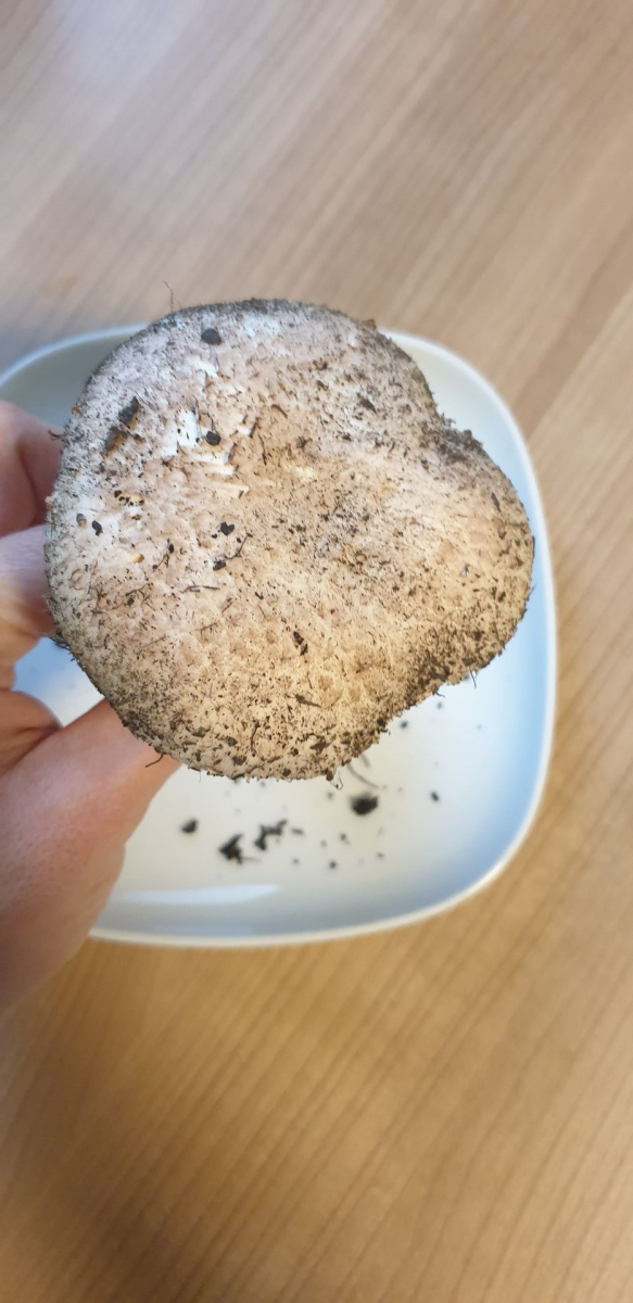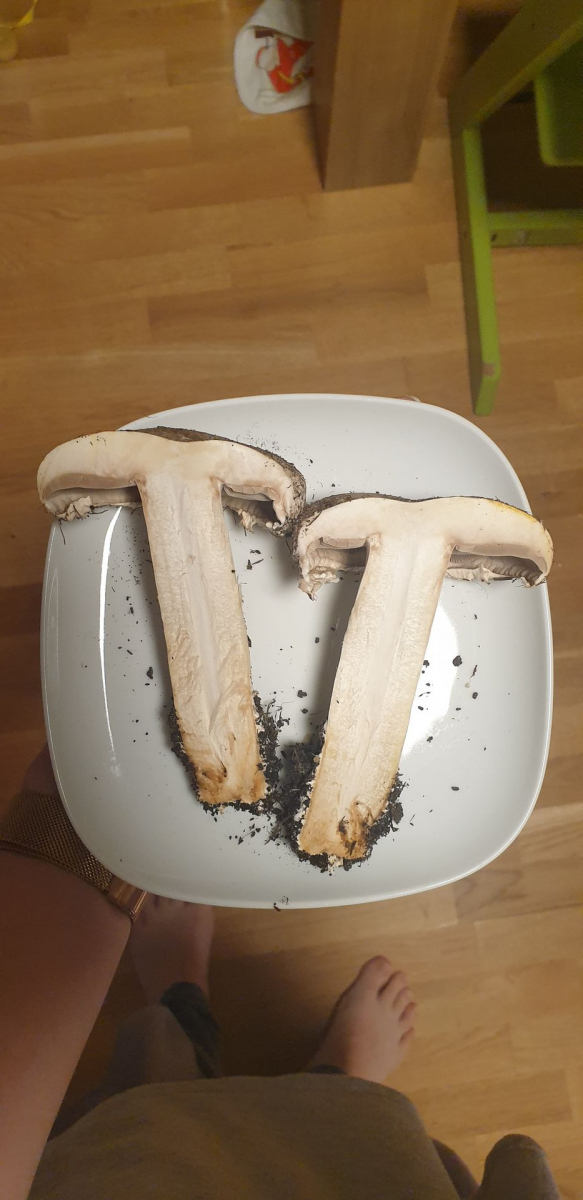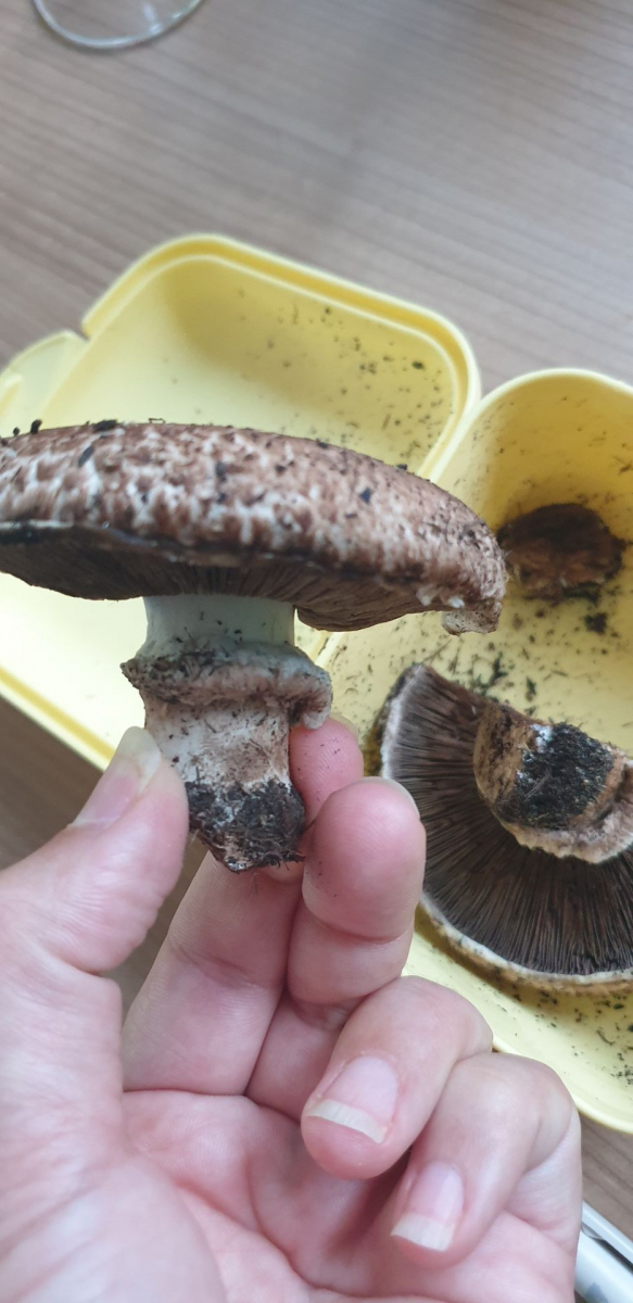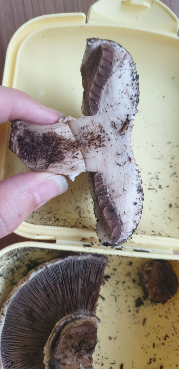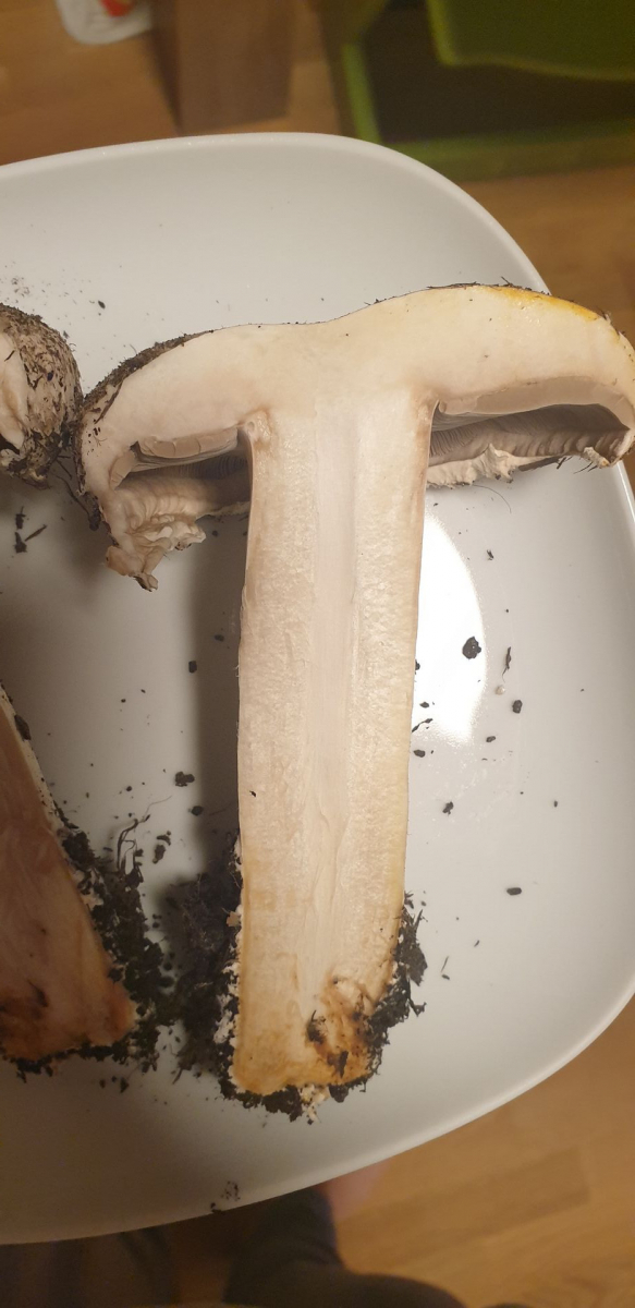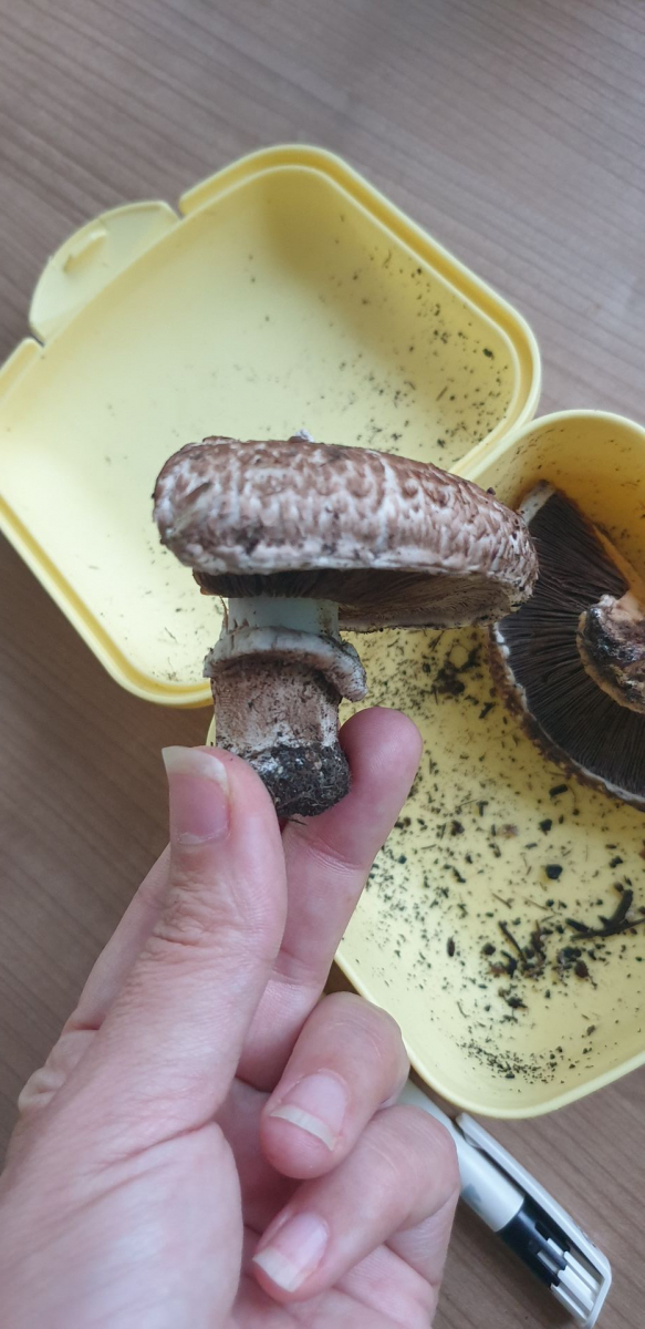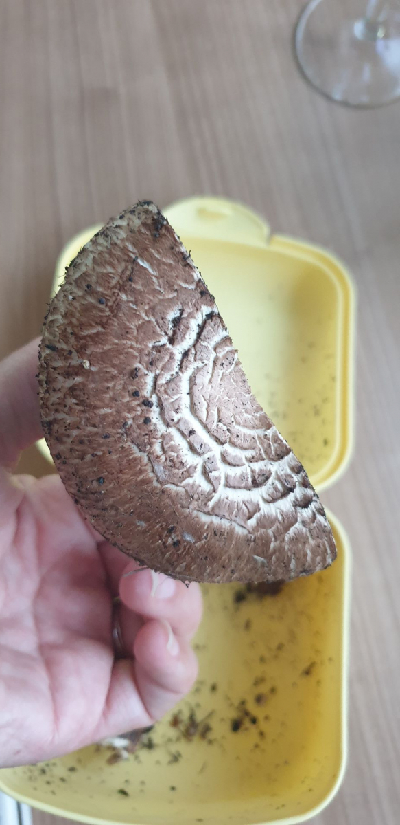 Er riecht nach dem anschneiden genau wie ein Zuchtchampignon, eine kleine Geschmacksprobe ergab, dass er auch genauso schmeckt. Wenn ich etwas Haut vom Stiel abziehe verfÀrbt er sich nicht, wenn ich den Strunk abschneide wird er braun. Die Lamellen sind schön rosa.