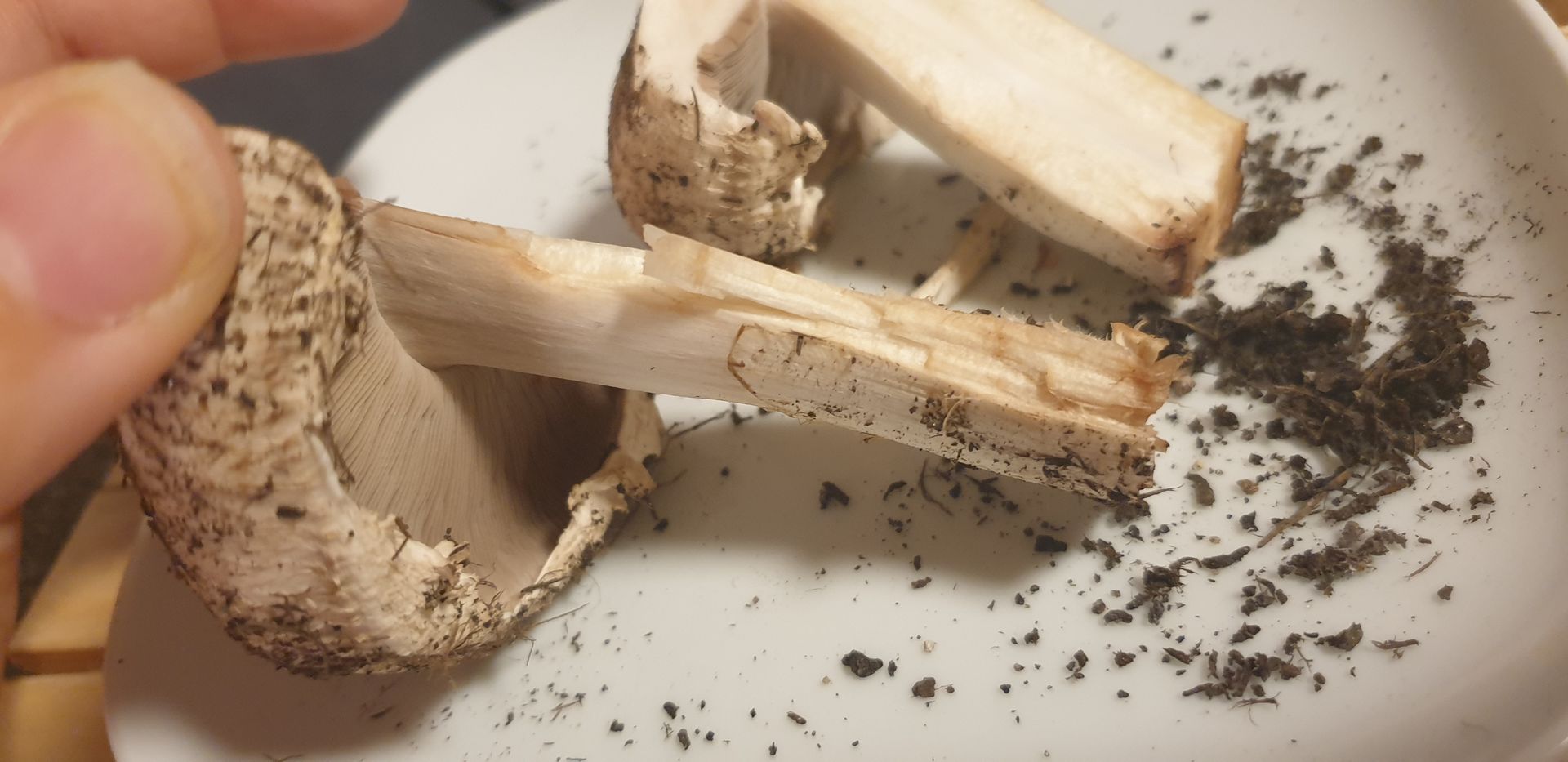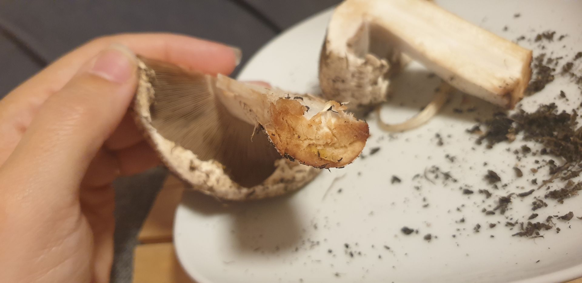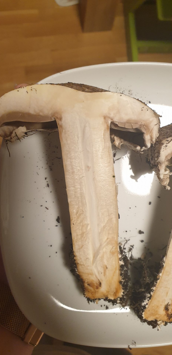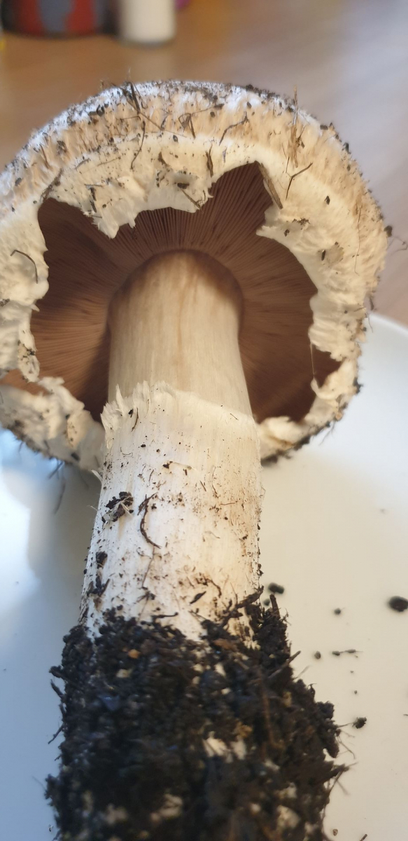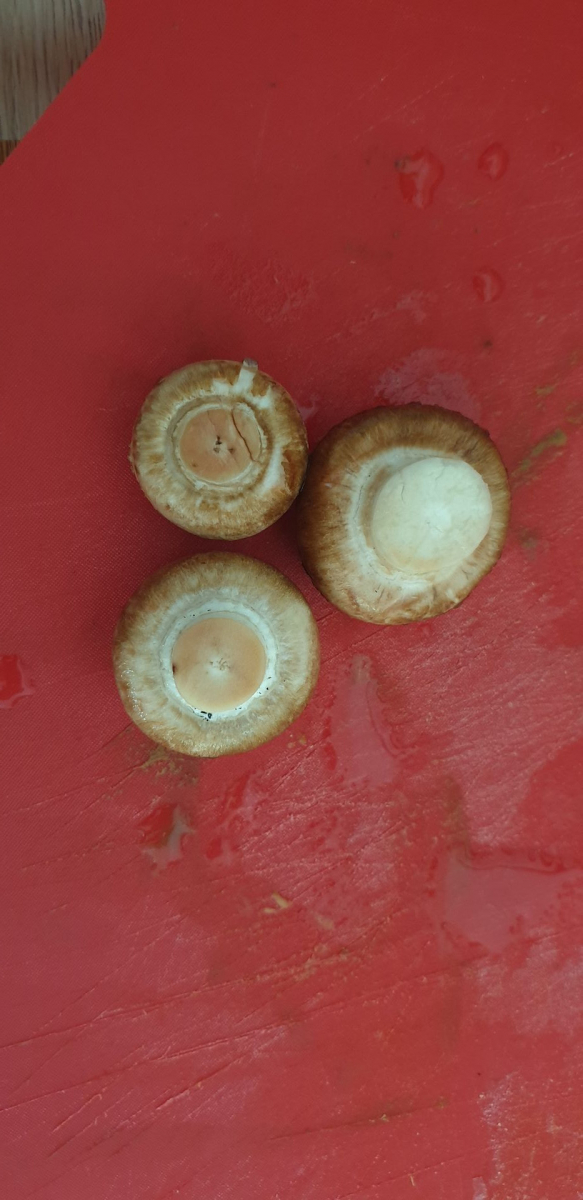 Er riecht nach dem anschneiden genau wie ein Zuchtchampignon, eine kleine Geschmacksprobe ergab, dass er auch genauso schmeckt. Wenn ich etwas Haut vom Stiel abziehe verfÀrbt er sich nicht, wenn ich den Strunk abschneide wird er braun. Die Lamellen sind schön rosa.
